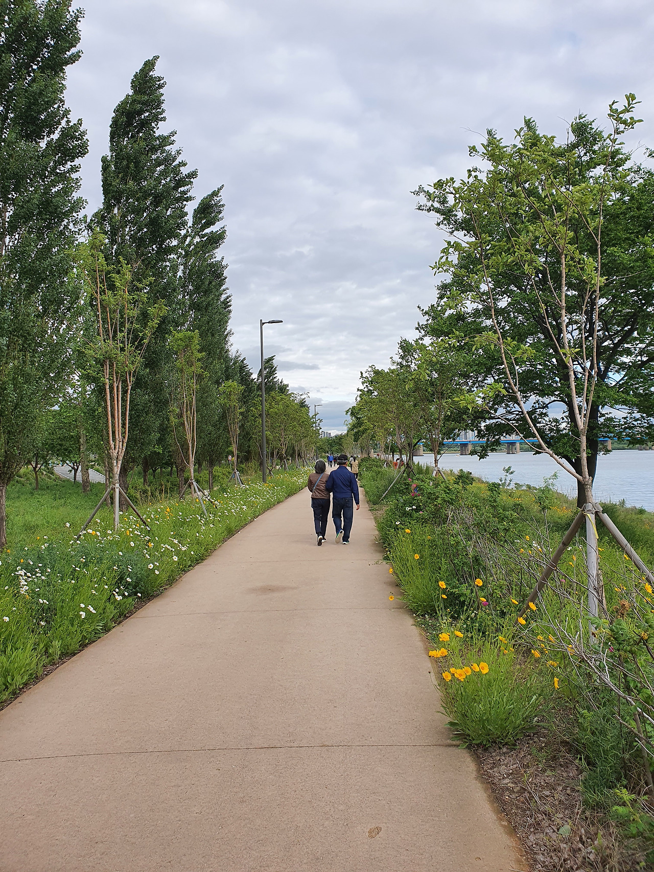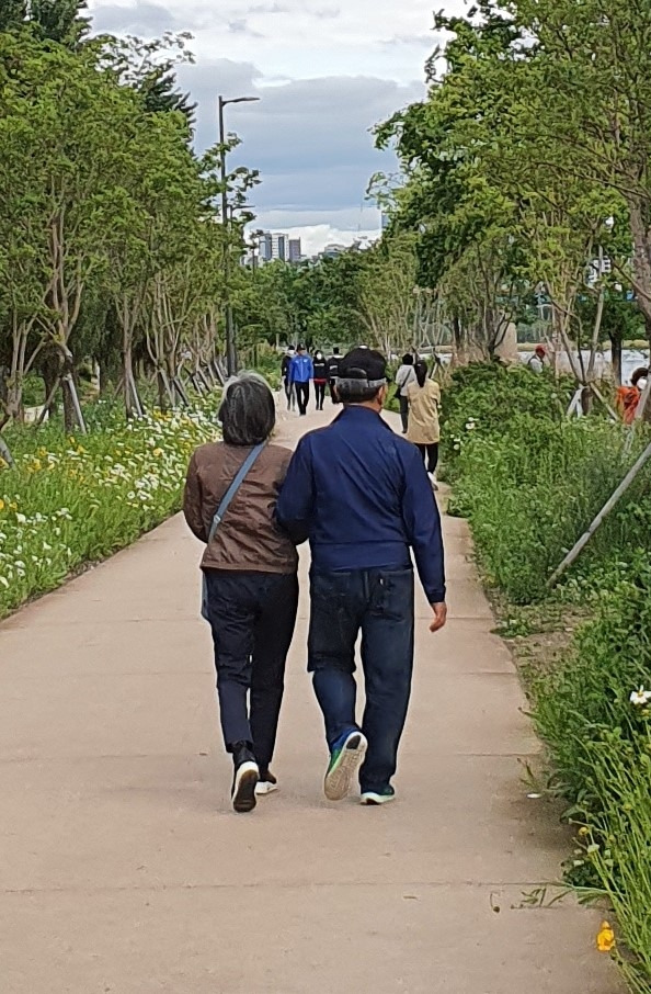 역시 한강 고수부지에서 찍은 사진. 손 잡은 정도가 아니라 팔짱을 끼고 나란히 걸으시는 모습이다. 주변의 노랗고 하얀 꽃들이 두 분의 산책길을 밝혀주는 듯하다. (2020년 5월 사진)