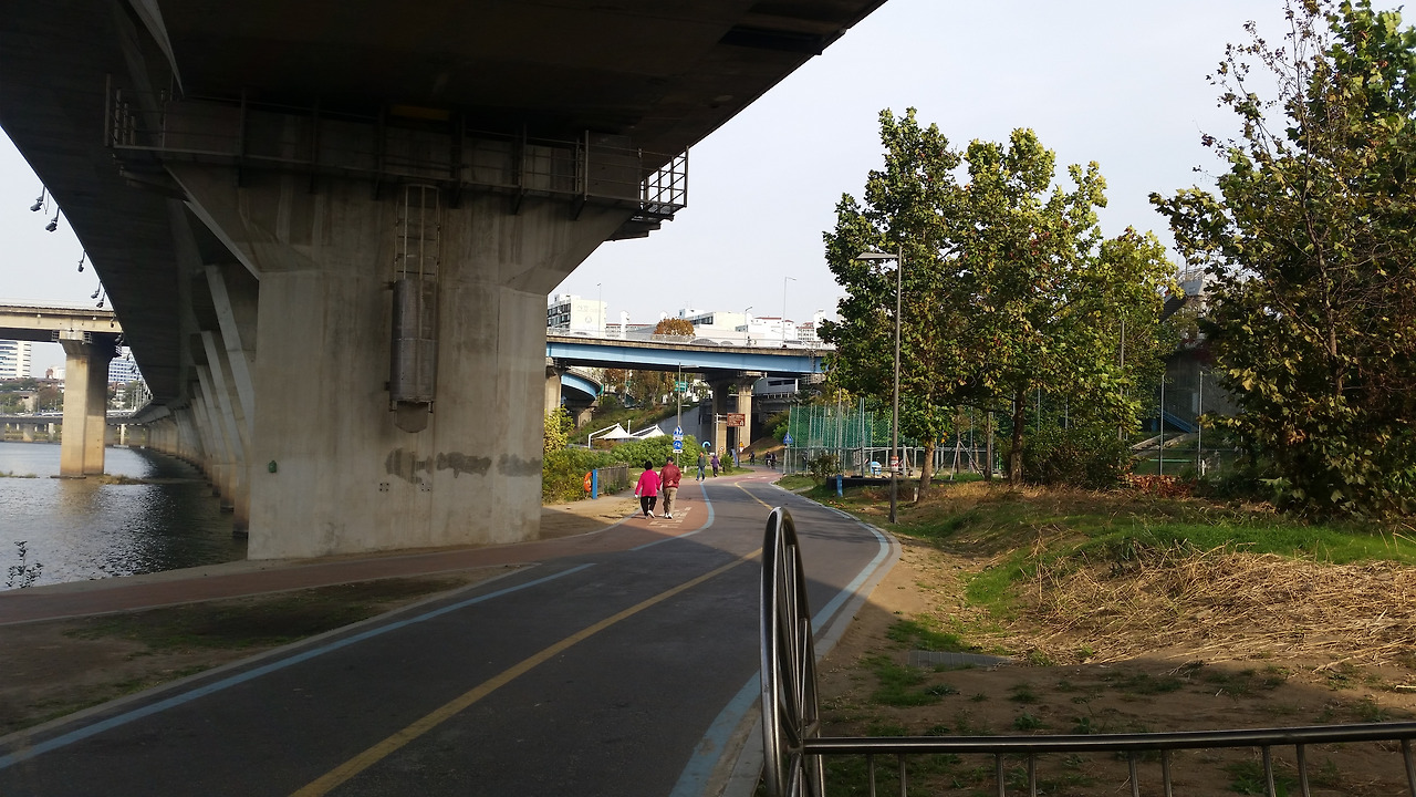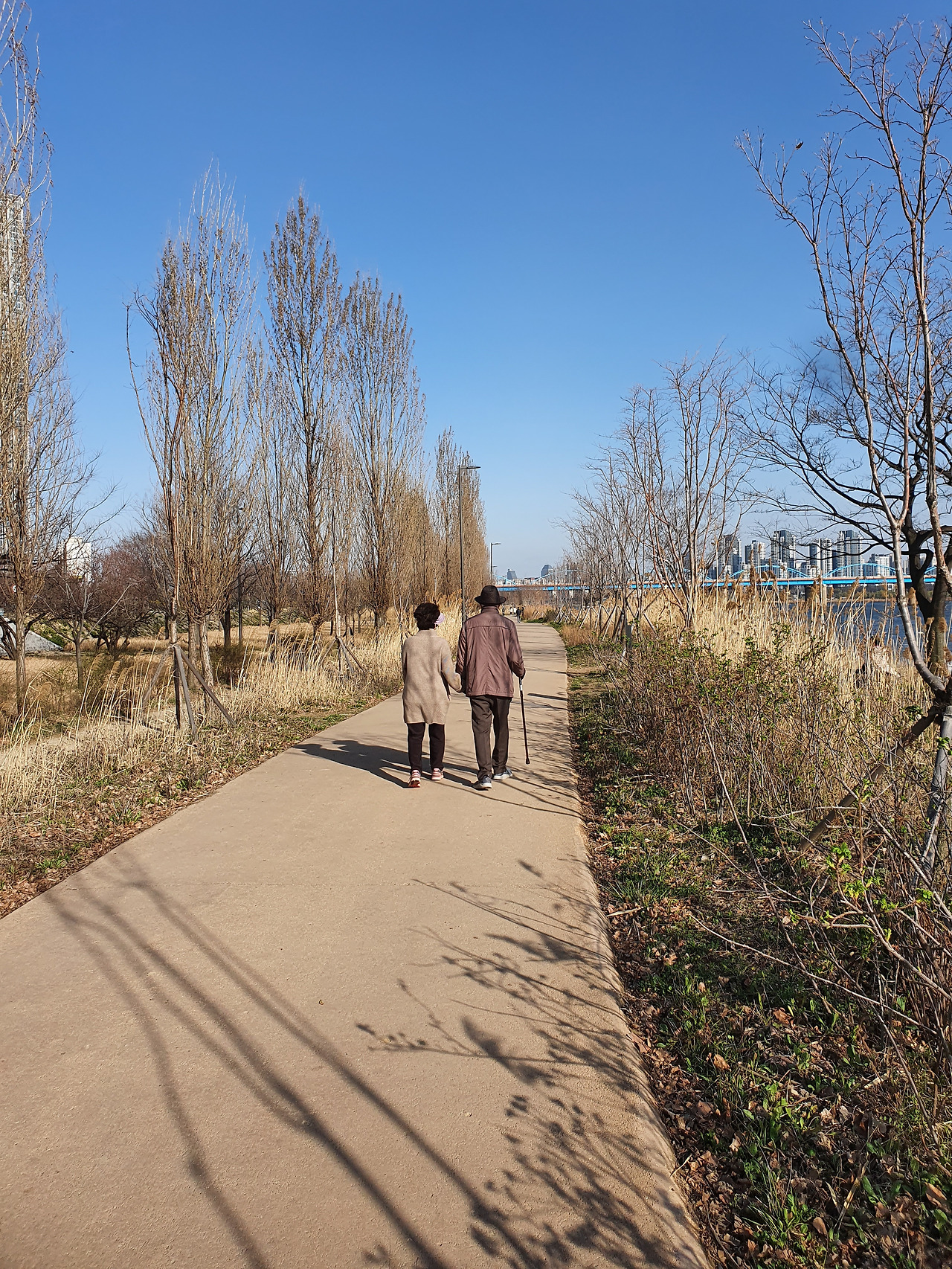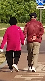 오전 9시경 한강 고수부지에서 찍은 사진인데 어르신 부부께서 함께 아침 산책을 하시는 모습이다. 할아버님은 허리나 다리 모두 아직도 곧아 보이시는데 할머님께서는 허리와 다리 이미 많이 굽으신 것 같다. (2015년 10월 사진)