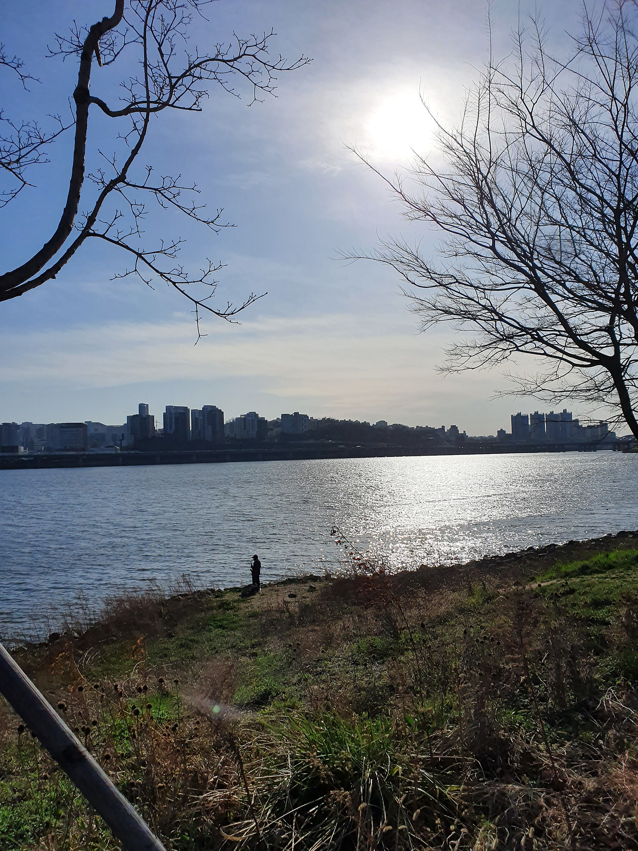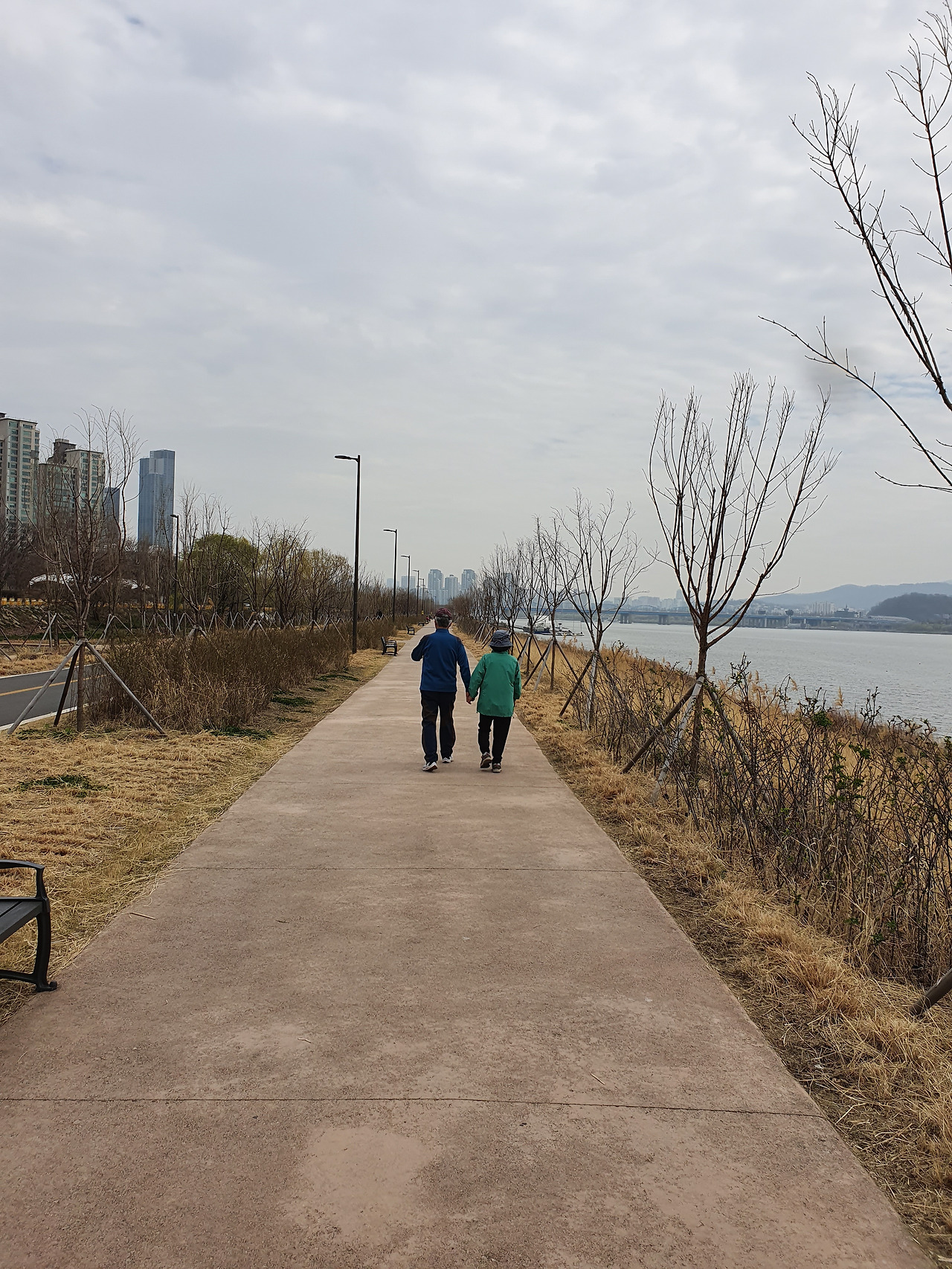 한강 고수부지에서 산책하시는 어르신들 모습. 요즘은 다시 고수부지에 사람들이 많아졌지만 당시는 코로나 확진자가 갑자기 크게 늘던 시기라 사진에서 보는 것처럼 한강변에도 사람이 별로 없었다. 집에 계시다 답답하니 두 분이 함께 고수부지로 산책 나오신 것 같다. (2020년 3월 사진)