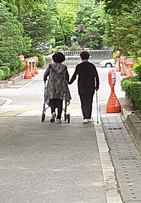 앞에 가서도 좀 더 자세히 봤는데, 자매간인지 모녀간인지 정확히 구분이 잘 안되지만 70은 넘어 보이시는 두 분이 휠체어를 지팡이 삼아 나란히 걷고 계시는 모습이다. 부부는 아니지만 서로를 도닥거려 주시는 모습이 꽤 다정해 보였다. (202년 5월 사진)