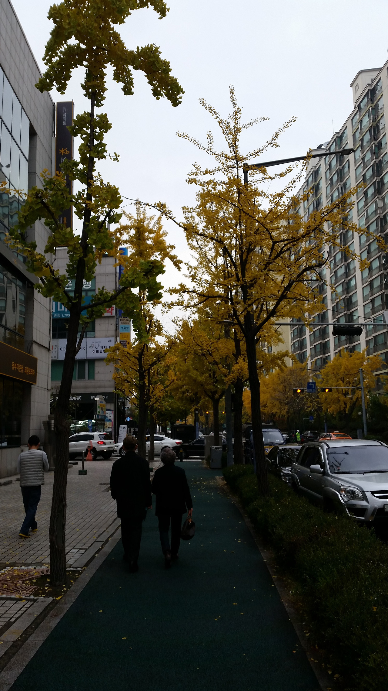 가을 저녁 은행나무 사이로 나란히 걷고 계신 두 분 모습. 노랗게 물든 은행잎이 두 분의 황혼을 축복하여 주는 것 같다. (2016년 11월 사진)