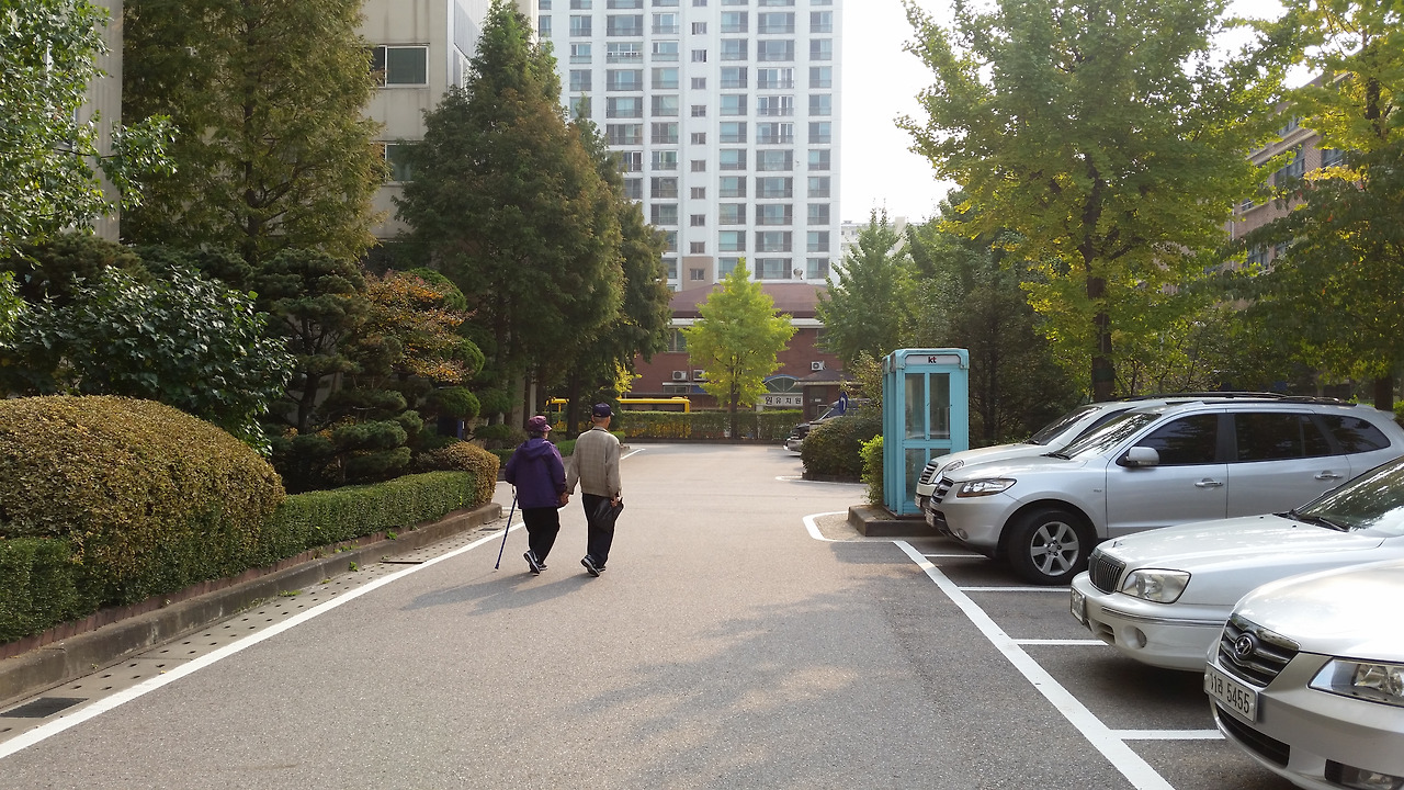 이촌동 한강성당 근처를 걸어가시는 어르신들 모습. 아직은 따듯한 늦여름 오후 2시경 사진인데, 두 분이 댁에서 점심 드시고 어딘가로 산책을 가시는 모양이다. (2015년 10월 사진)