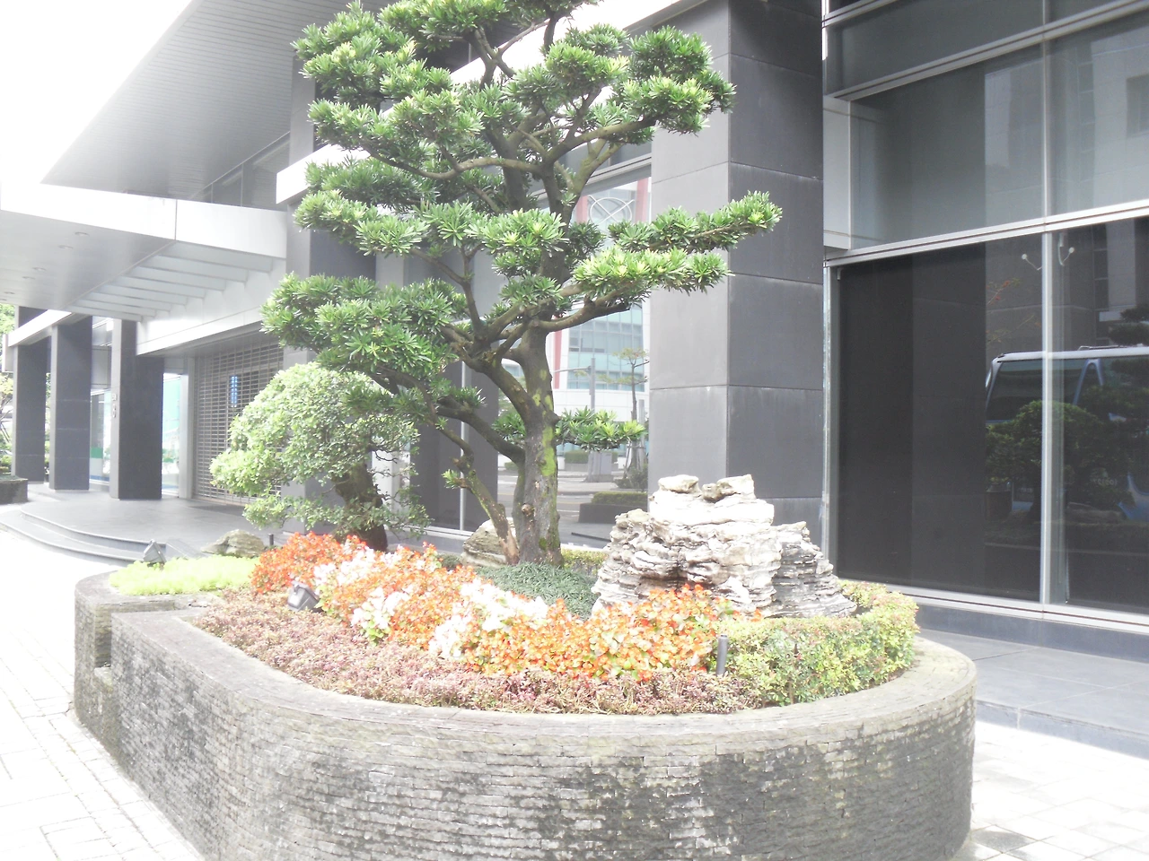사진) 법인 근처 거리의 미니 정원. 2평 남짓의 작은 공간이 소나무, 돌, 화초, 잔디 등으로 정성스럽게 꾸며져 있었는데 마치 소나무 분재가 거리 한복판에 심어져 있는 것 같았다. (2010. 4월)