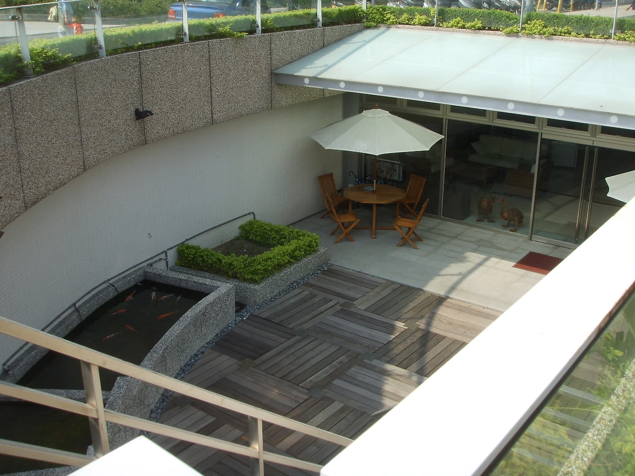 사진) 빌딩 지하층인데 천정이 뚫려 있어 지하까지 햇살이 내리쬐는 모습. 바닥에는 목재 데크가 깔려 있고 좌측에는 붕어가 떠다니는 미니 호수도 보인다 (2007. 10월).