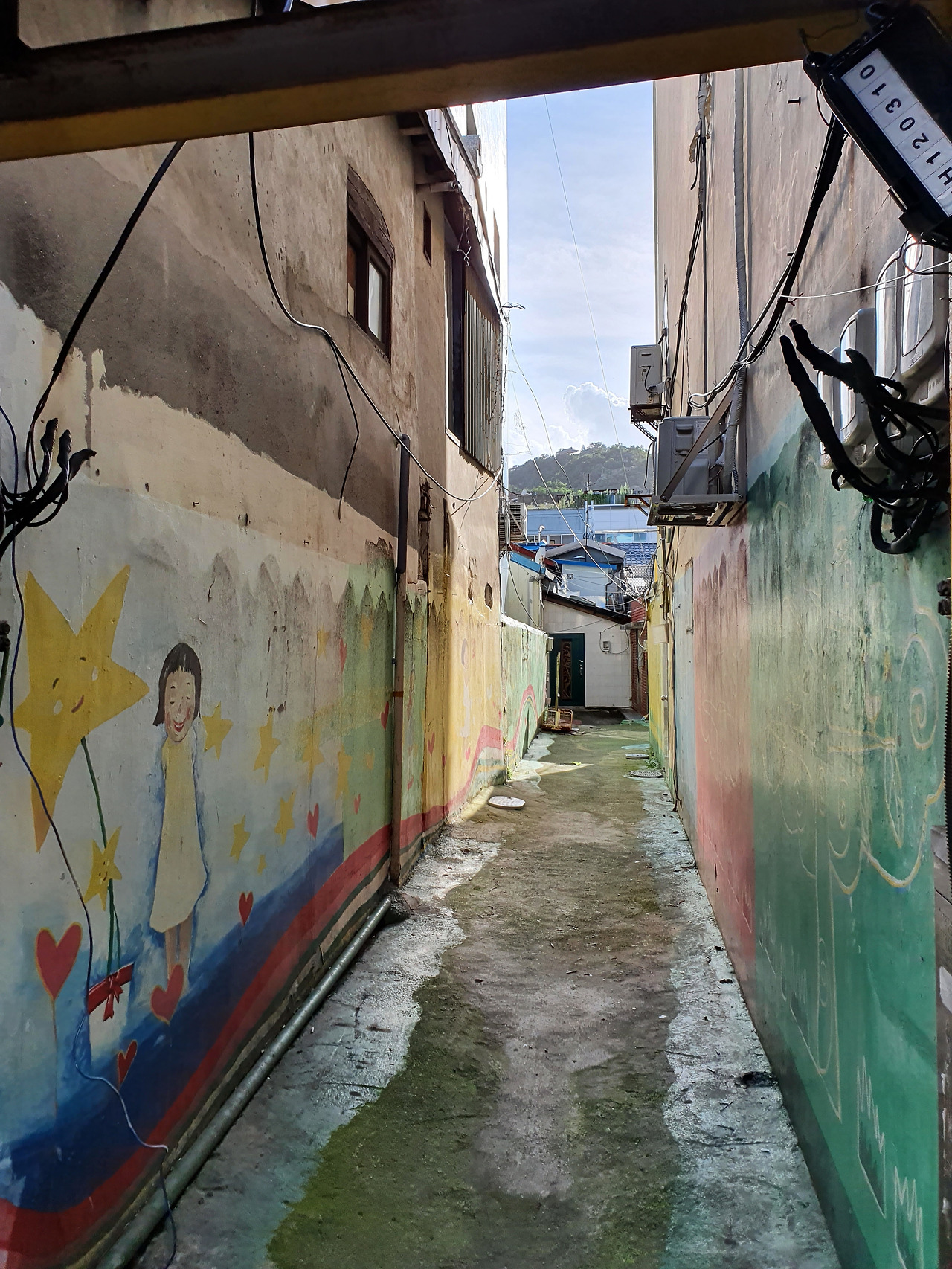 사진) 소녀와 별과 하트가 그려진 골목 담벼락 사이로 파란 하늘이 보이는 목포역 인근 골목 모습