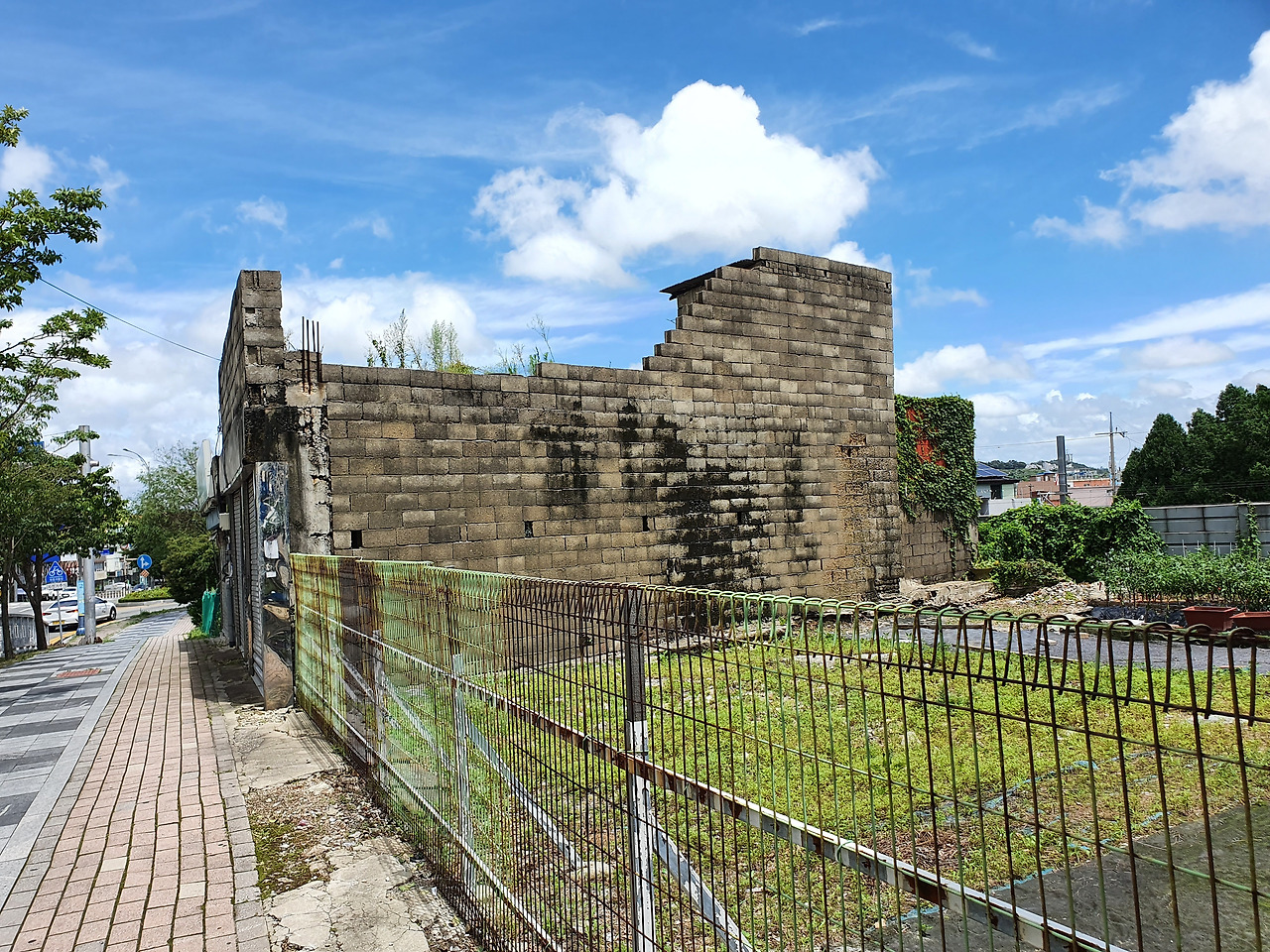 '영산로 182번지'라는 주소가 표기된 도로변에도 벽돌로 지어진 오래된 건물이 있었는데, 이 건물은 지붕이 통째로 사라진 상태로 사방의 벽만 폐허처럼 남아 있었다. 반파된 건물 안과 벽에 무성하게 자라고 있는담쟁이덩굴과 잡초가 오래전 과거 목포 역사를 조용히 말해주고 있는 것 같았다.