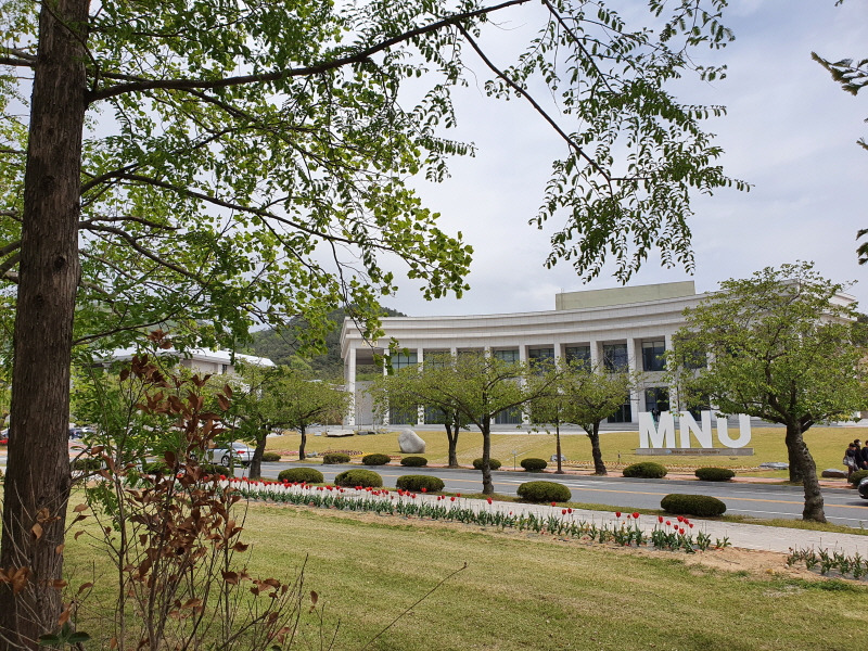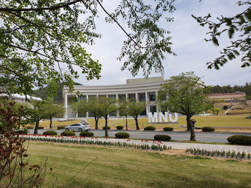 위 사진에 보면 'MNU'라는 글자 모형이 잔디 위에 세워진 모습도 보이는데, 'MNU'는 목포대즉 'Mokpo National University'의 약자라 한다. 이 글자 뒤 건물은 목포대 설립 70주년을 기념하여 2016년에 건축된 대강당이라 했는데, 전면이 타원형으로 되어 있는 이 건물은 그 규모도 컸지만 미적 측면에서 봐서도 매우 아름다운 건물이었다.