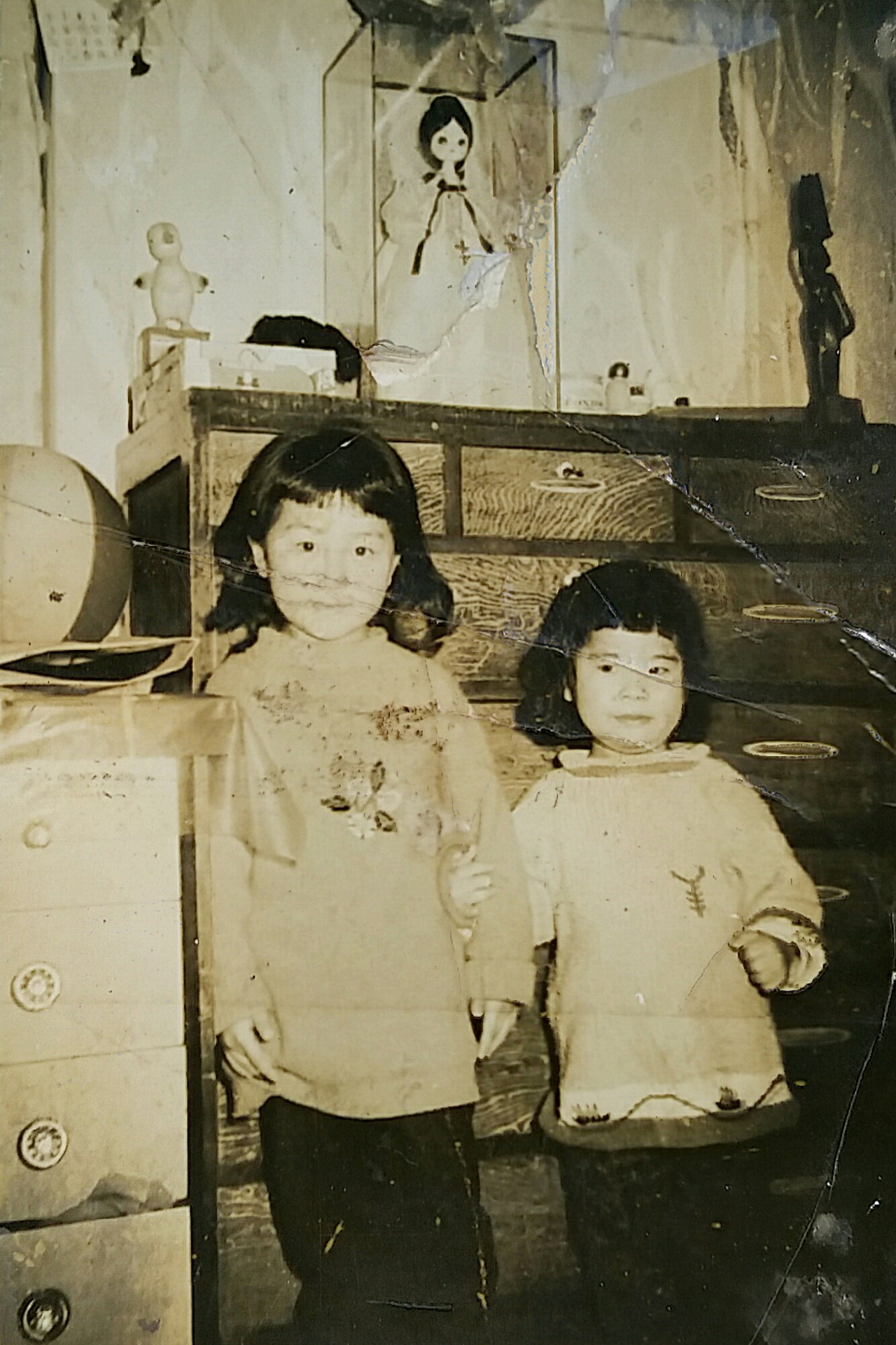 장롱 위에 있는 한복 입은 저 인형은 그 당시에는 집집마다 거의 있었을 만큼 흔했던 기억이 있다. 큰 아이가 누님인데 작은 아이는 누군지 모르겠다.