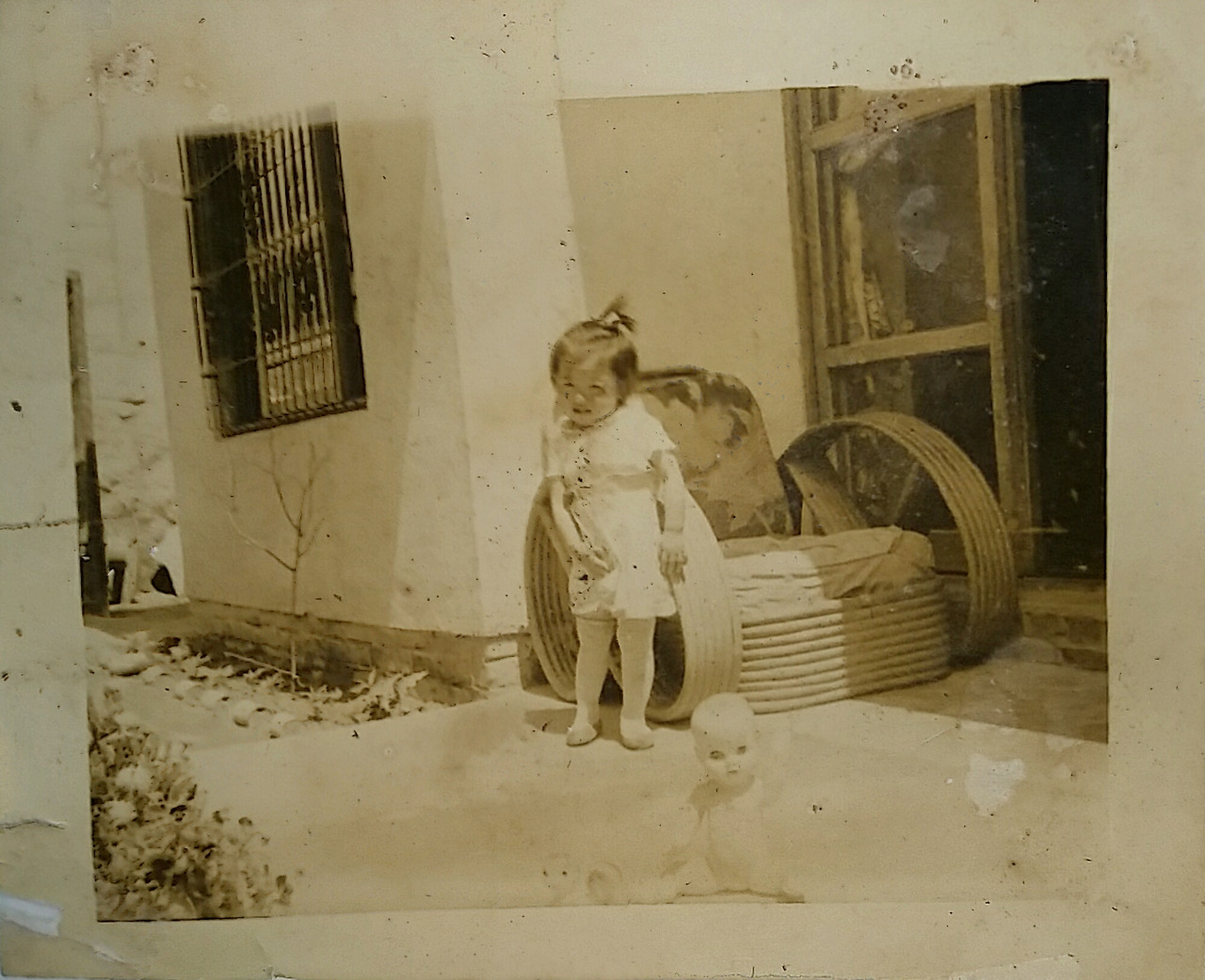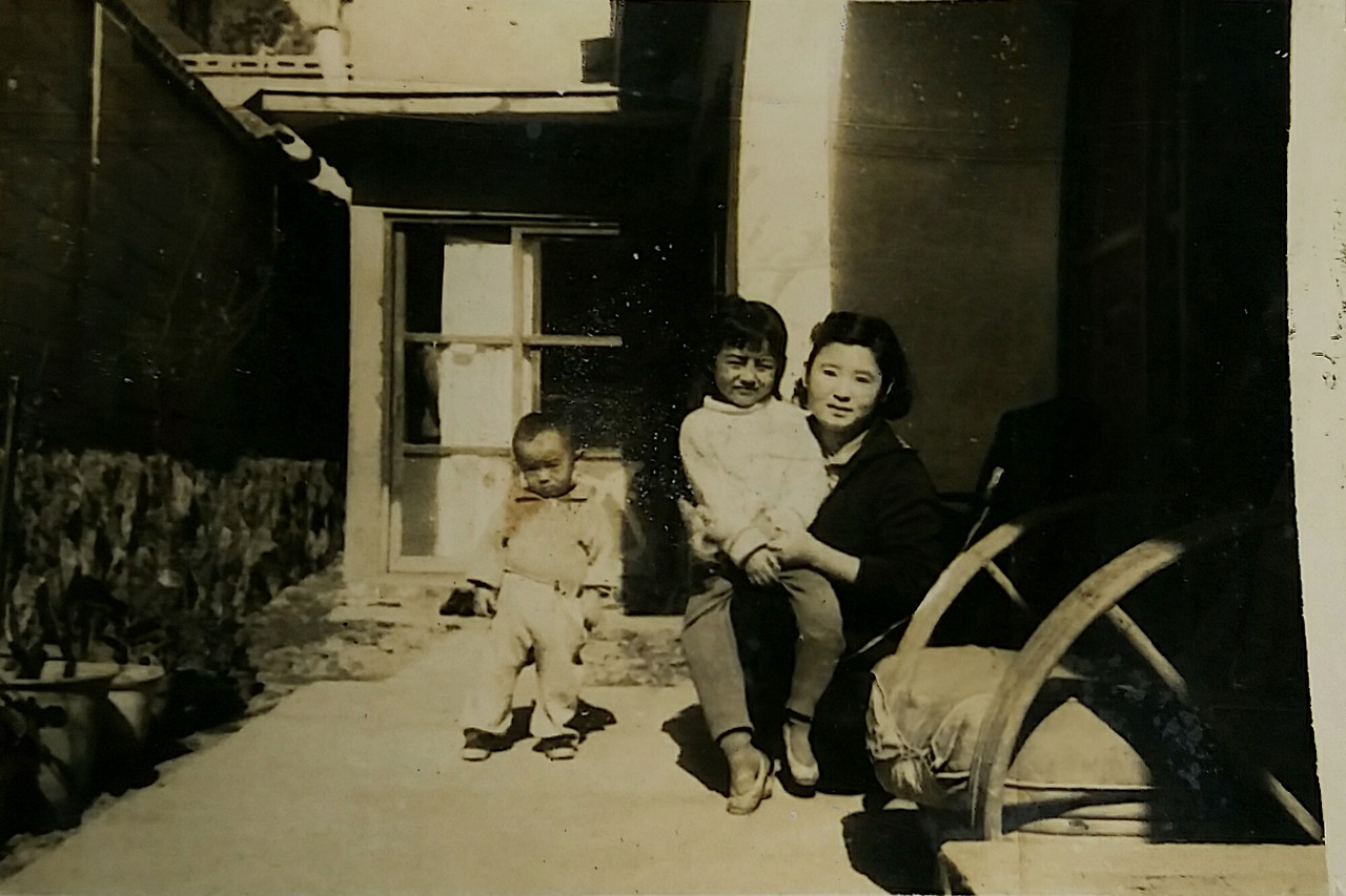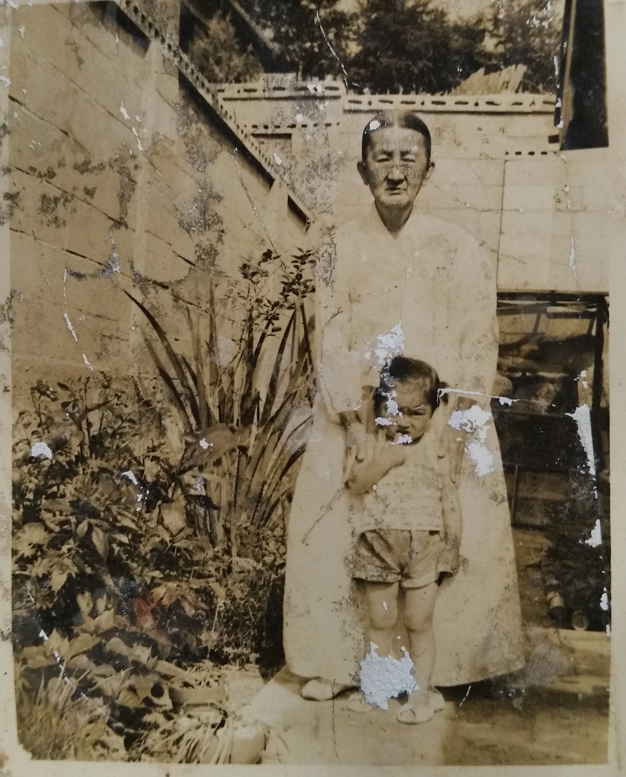 사진) 돈암동 집 마당에서 찍은 누님 사진.누님 뒤에 계신 할머님은 누님의 증조 할머님이신데 그 시절에는 드물게 꽤 장수하셔서80세 가까이까지 사시다 돌아가셨다 한다.