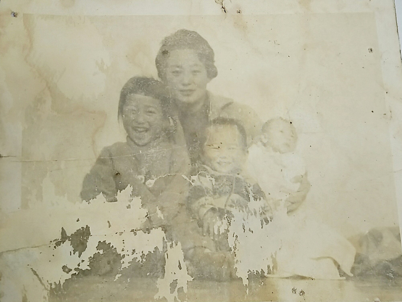 사진) 돈암동 집 방 안에서 어머님 품에 안겨서 환하게 웃고 있는 삼 남매.