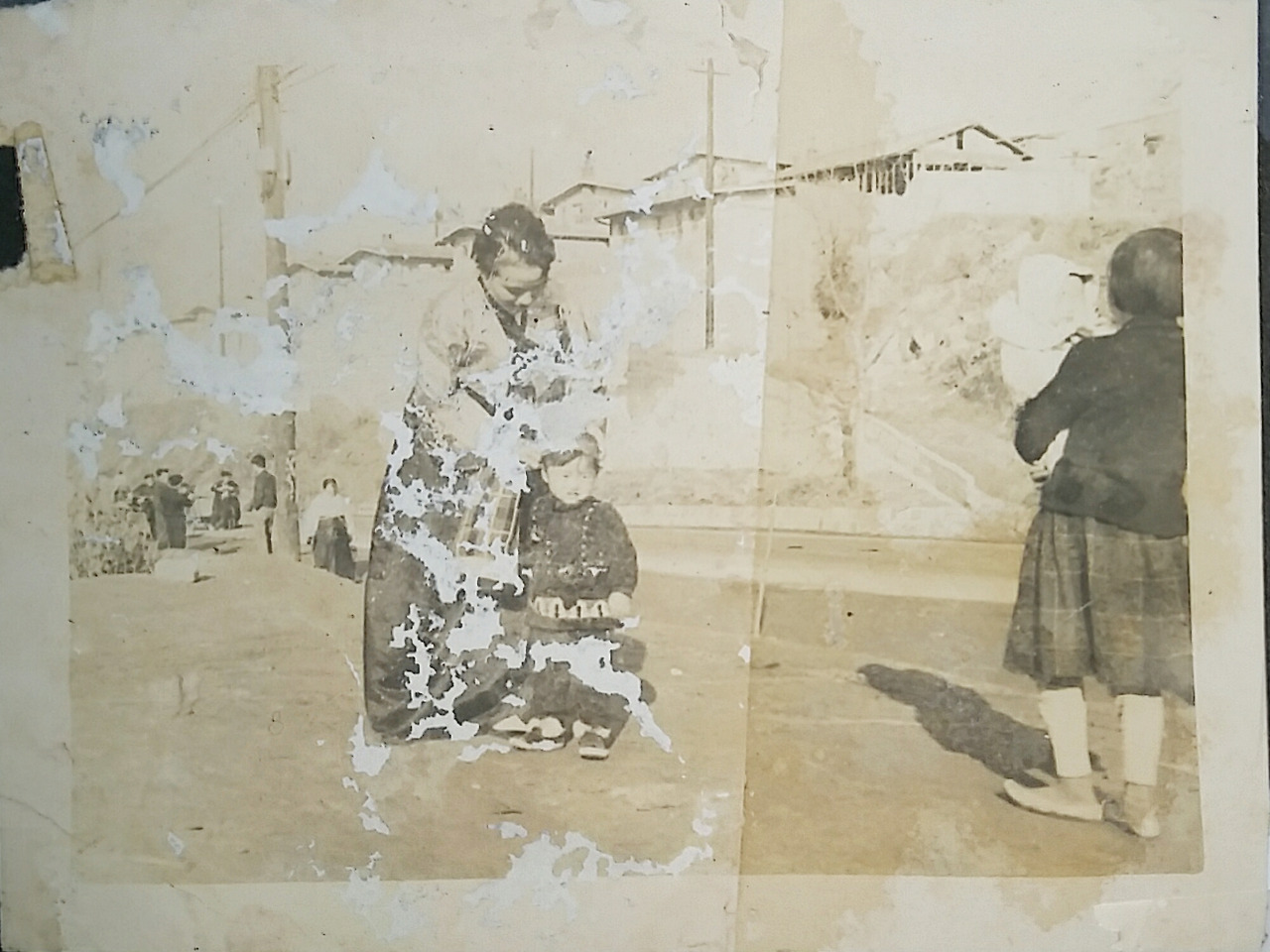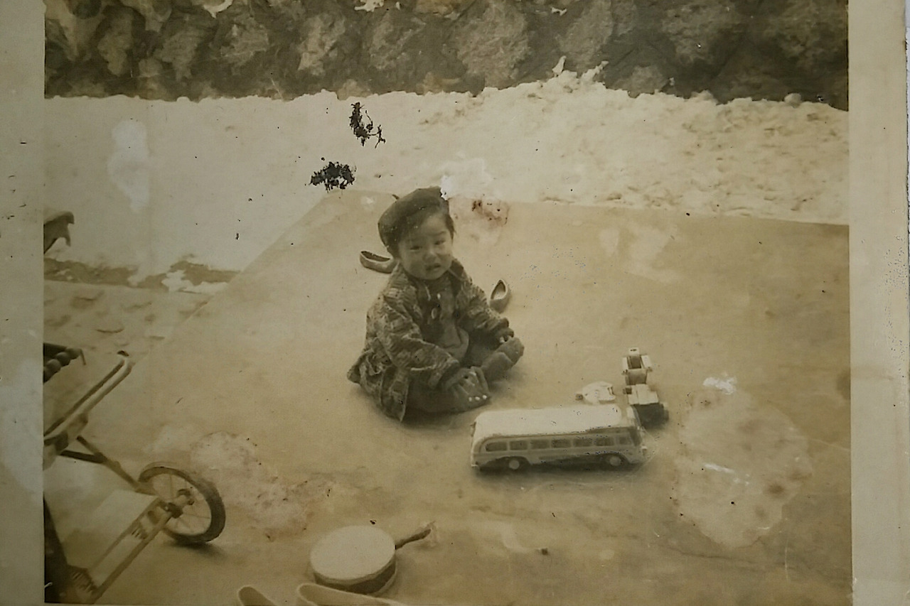 사진) 누님이 장난감을 갖고 돈암동 집 앞 골목길 맨바닥에 앉아서 놀고 있는 모습. 길 옆으로는눈이 잔뜩 쌓여 있다.누님 나이로 볼 때1961년 경 사진으로 보인다.