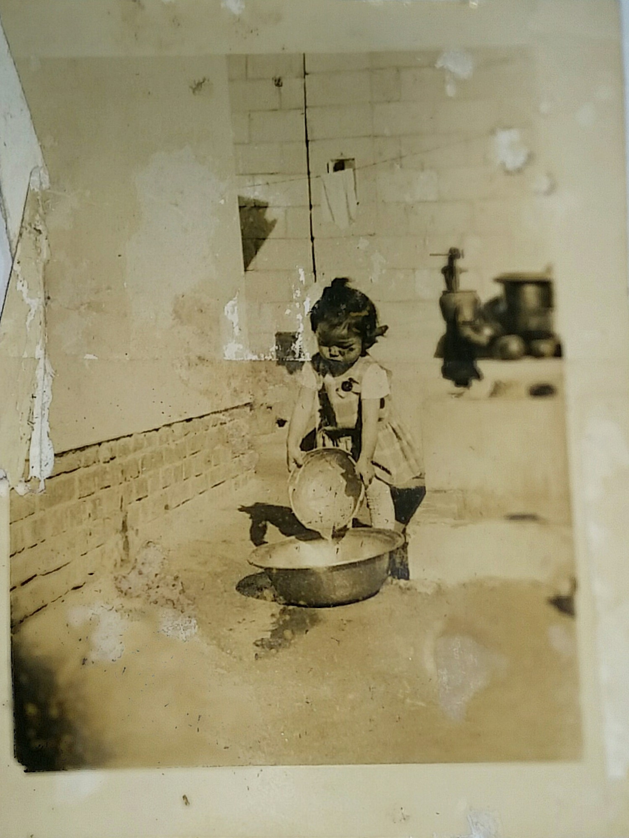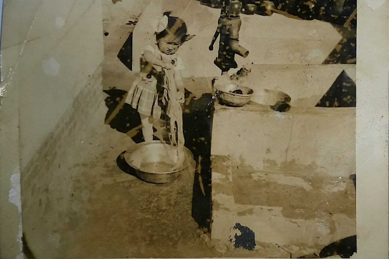 사진) 3살쯤 되어 보이는 나이의 누님이 돈암동 집 마당의 우물 근처에서 물장난을 하는 모습. 어머님께서 빨래하시는 모습을 아마도 그대로 흉내 내고 있는 것 같다. 요즘은 쉽게 보기 어려운 우물과 펌프를 사진으로나마 오랜만에 이렇게 다시 보니 꽤 반갑다.