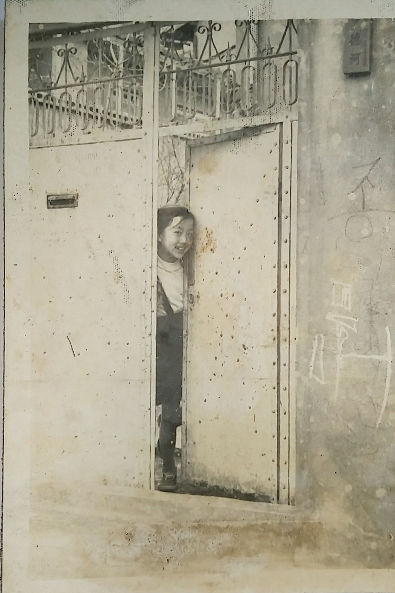 사진) 세 번째 철제 대문 모습. 두 번째 대문사진으로부터또다시 2~3년 정도 시간이 더 경과한 1965~6년 경 찍은 것으로 보이는데 그 사이 더 성장해서 이제는어느덧 소녀 티가 나기 시작하는 누님이 대문을 살짝 열고 미소를 짓고 있다. 돈암동 집 대문이 변해가는 모습과 함께 우리 가족의 세월도 그렇게 서서히 흘러가고 있었던 것이다....