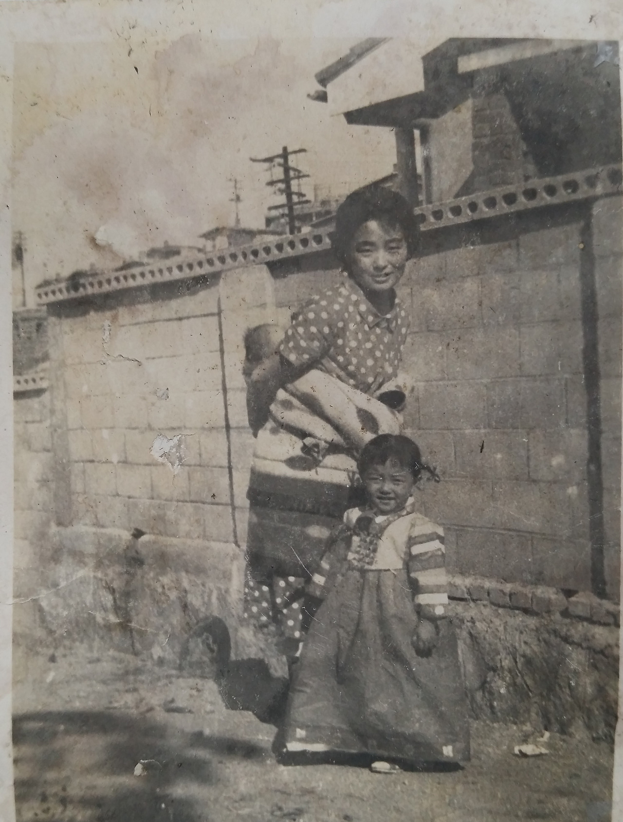 사진) 결혼 후 돈암동 집 앞 골목에서 찍은 어머님의 초췌한 모습. 누님을 보면서 나까지 업고 찍은 사진인데결혼 전의 사진 속 어머님 모습과는 너무도 다른 모습이다.
