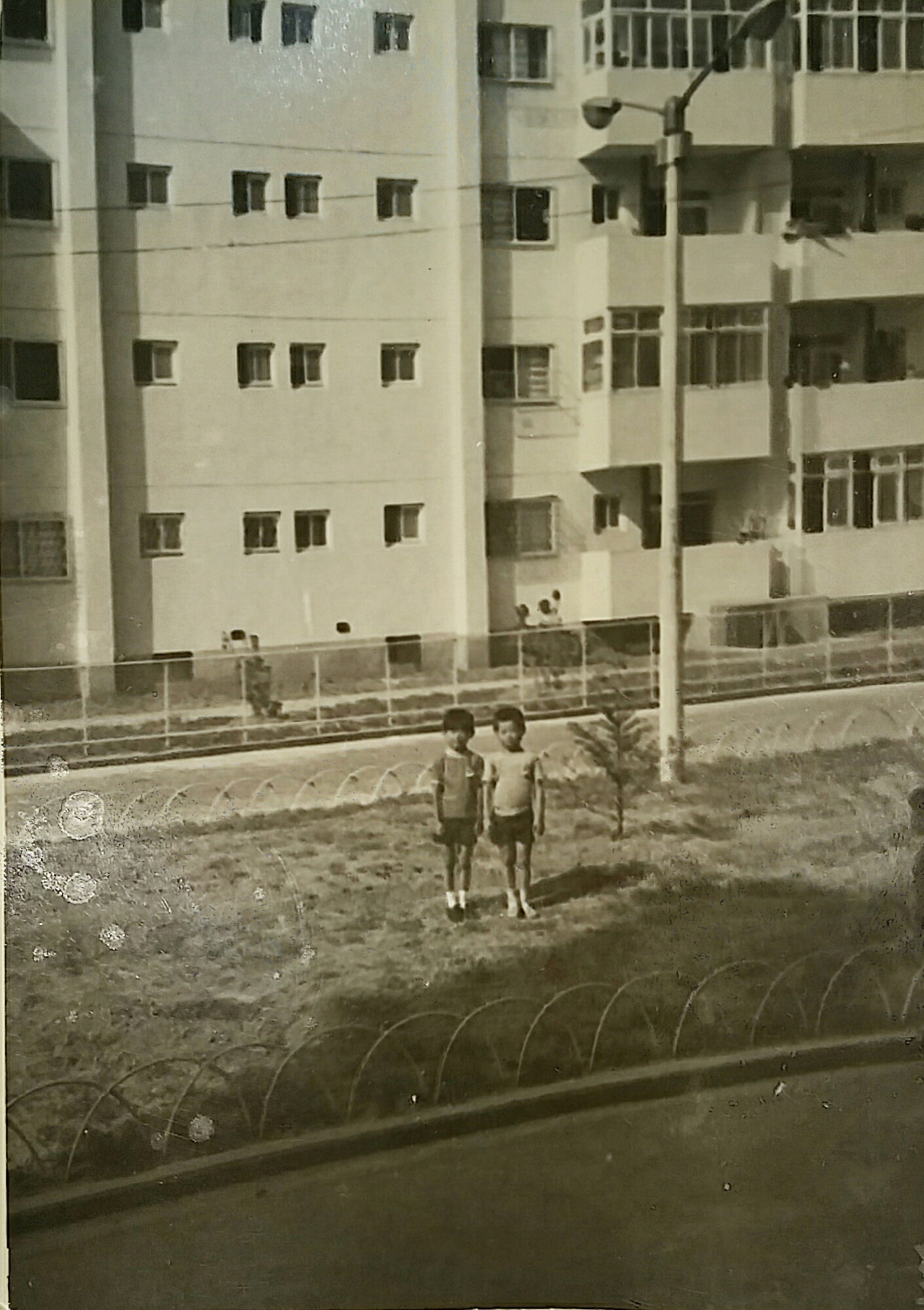 사진) 공무원 아파트 23동과 24동 사이의 잔디에서 친구와 함께 찍은 사진. 1970년 사진.
