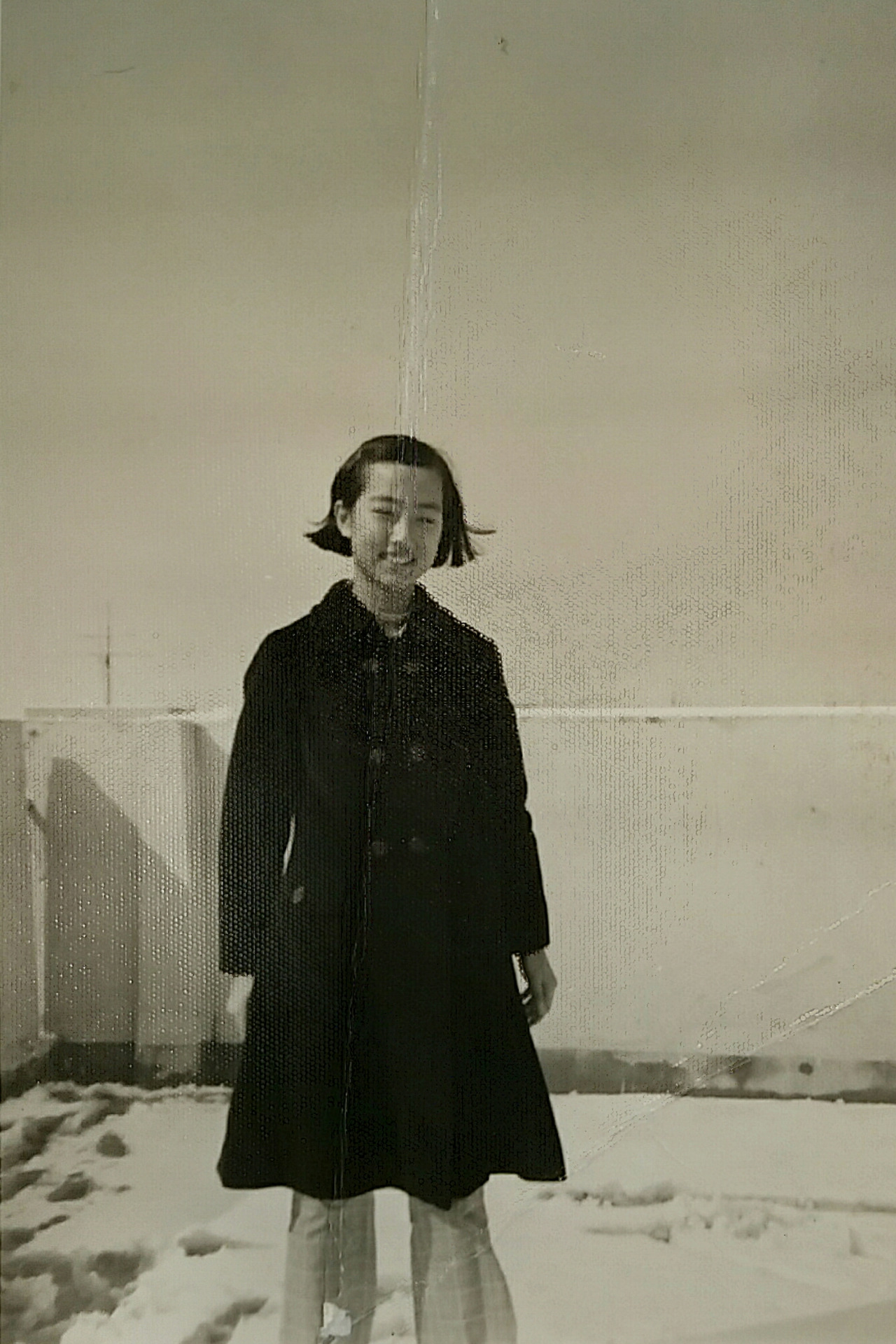 사진) 위 사진과는 다르게 겨울에 눈이 쌓여 있는 한강맨션 옥상에서 찍은 누님 사진. 1972~3년 경 사진으로 보인다.