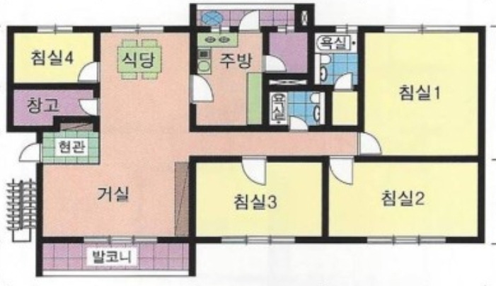 사진) 한강 맨션 55평 평면도. 이런 아파트 두 채를 터서 한 집으로 사용하고 있었으니 친구 집에는 방 8개에 화장실이 4개, 주방이 2개가 있었던 셈인데, 그 넓은 집에 거주하는 가족은 가사 도우미 포함 고작 5명이었다.