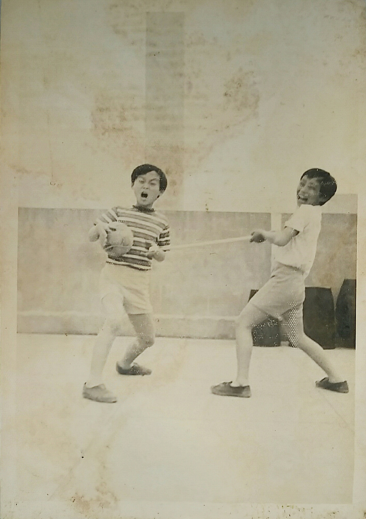 사진) 한강맨션 옥상에서 동생과 공놀이를 하고 있는 모습. 1971~2년경 사진인 듯한데 반바지를 입고 있는 것으로 볼 때 한여름에 찍은 사진으로 보인다.