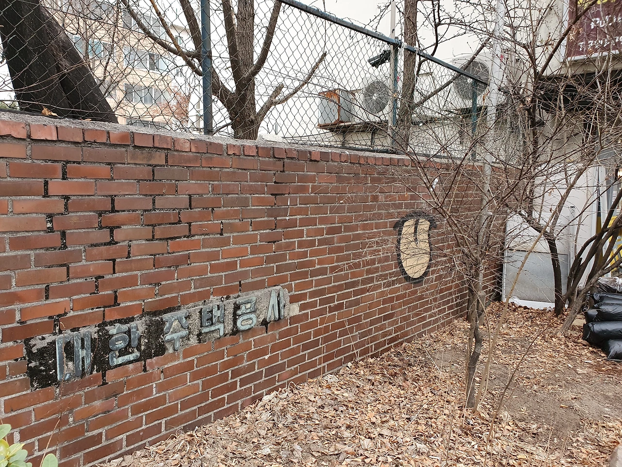 사진) 한강맨션을 건축했던 대한 주택공사 이름이 2022년 현재까지 그대로 남아 있는 한강 맨션의 입구벽 모습. 한강 맨션 31동과 삼익 아파트 사이에 있다.