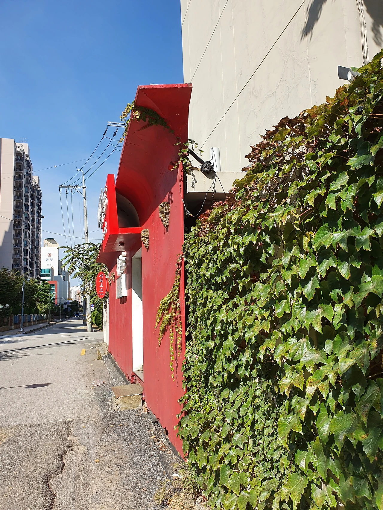 또한 이 카페에서 가장 가까운 상점도 최소 50미터 이상은 떨어져 있을 만큼 주변에는 상가가 없어서 이 카페는 홀로 외롭게 서 있는 것처럼 보이기도 하는데, 건물 입구가 온통 붉은색인 점이 주변의 회색 시멘트 건물들과는 강한 대비가 되기도 한다.