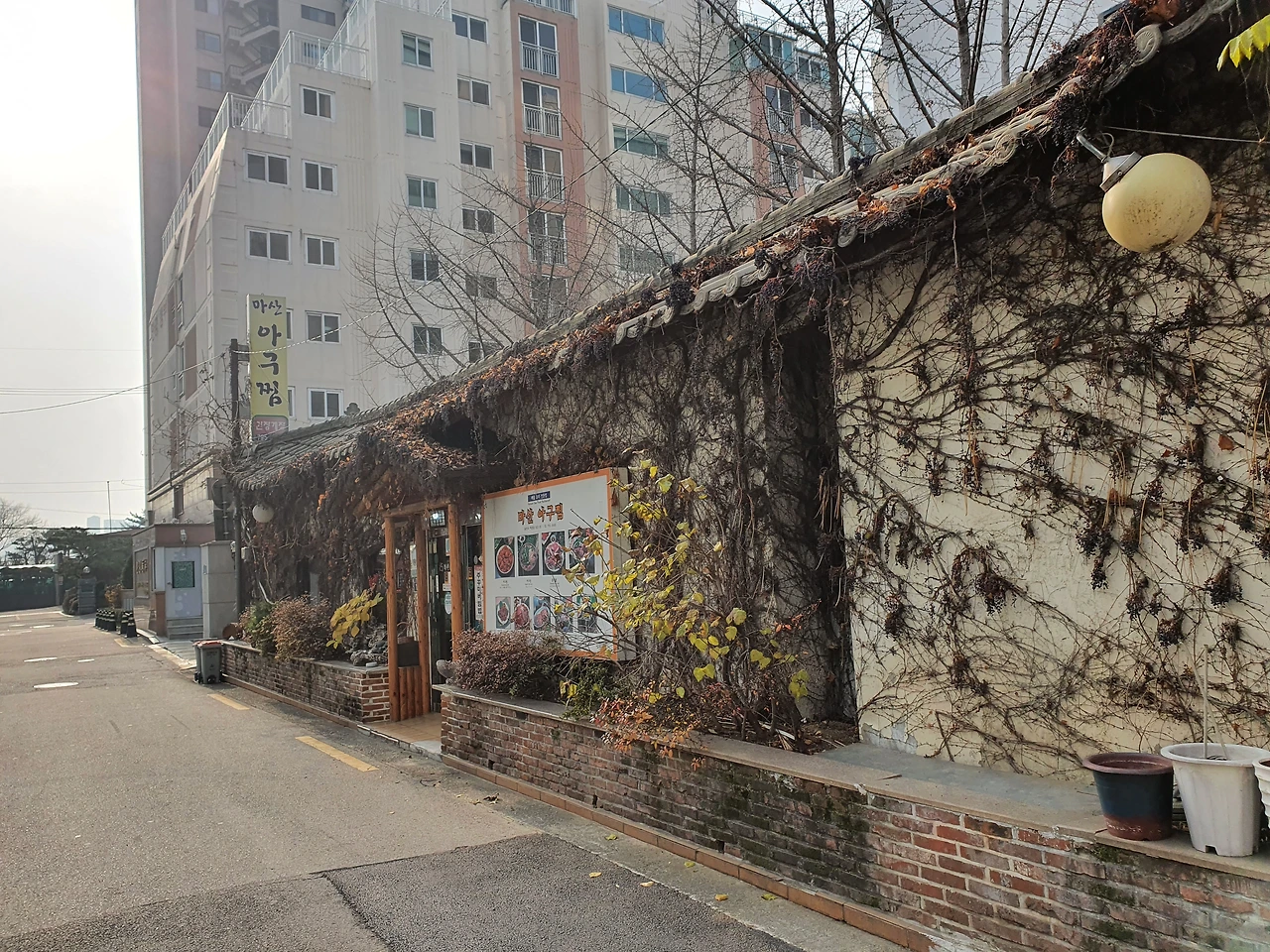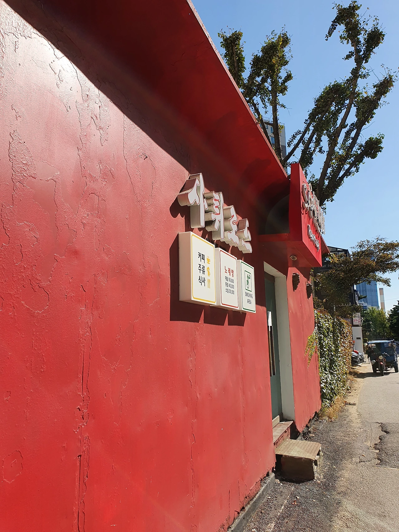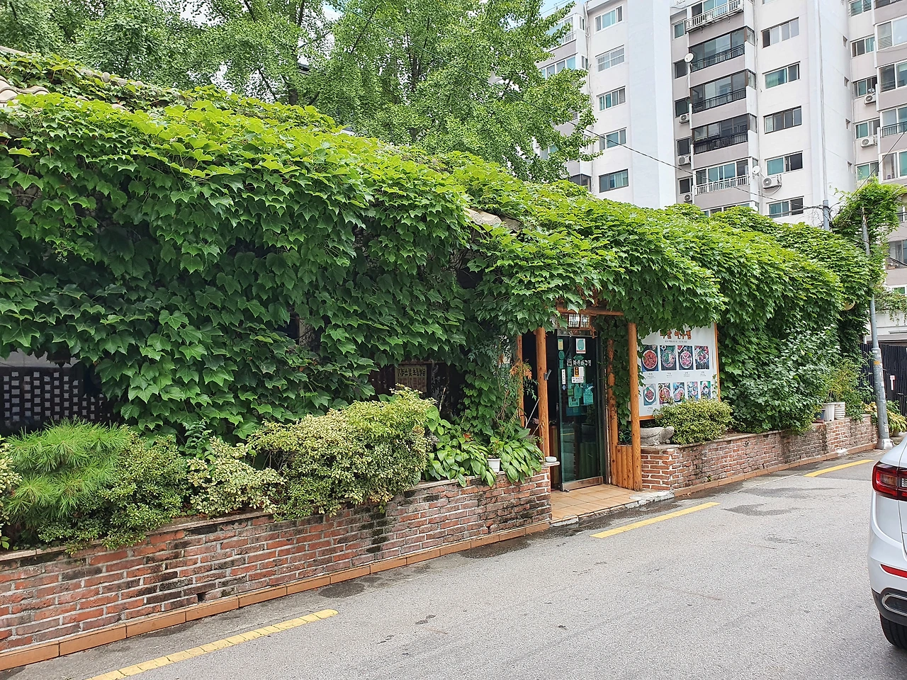 이 건물은 자세히 보면 지붕에 기와가 있는데 담쟁이덩굴로 워낙 짙게 뒤덮여 있어 잘 보이지가 않는다. 특히 위 사진에서도 볼 수 있는 것처럼 한여름에는 식당 출입구 외 나머지 공간은 모두 담쟁이덩굴로 짙게 덮여있어서 더더욱 그렇다. 이촌동에 기와가 있는 건물은 아마도 이 건물이 유일할 것이다.