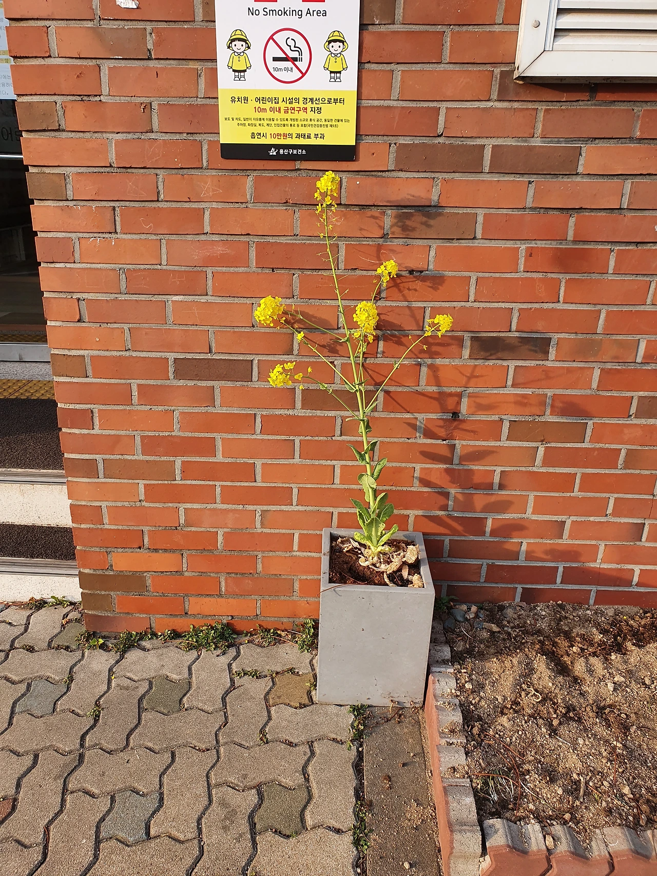 사진) 꿈밭 어린이집 외관과 건물 앞 화분 속 유채꽃 모습