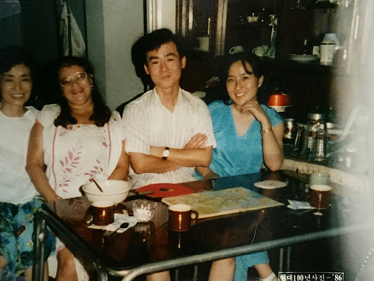 사진) 청탑에 거주하던 시절 외국인이 우리 집에서 한동안 체류할 때 어머님, 누님과 함께 찍은 사진 (1986년)