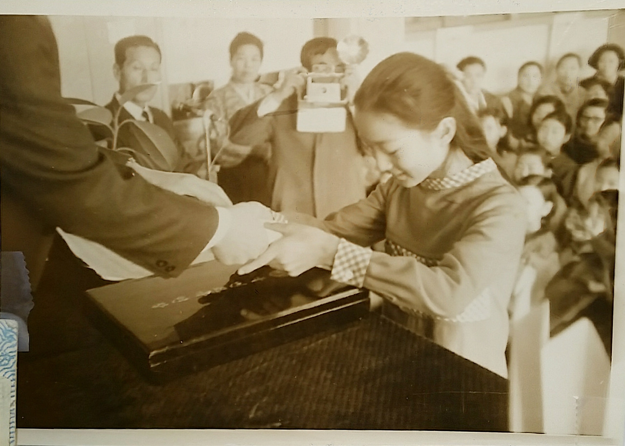 사진) 졸업식에서 누님이 상을 받는 모습.요즘 신용산 초등학교 교실 모습은 어떤지 알 수 없지만 70년대 모습은 이랬다.