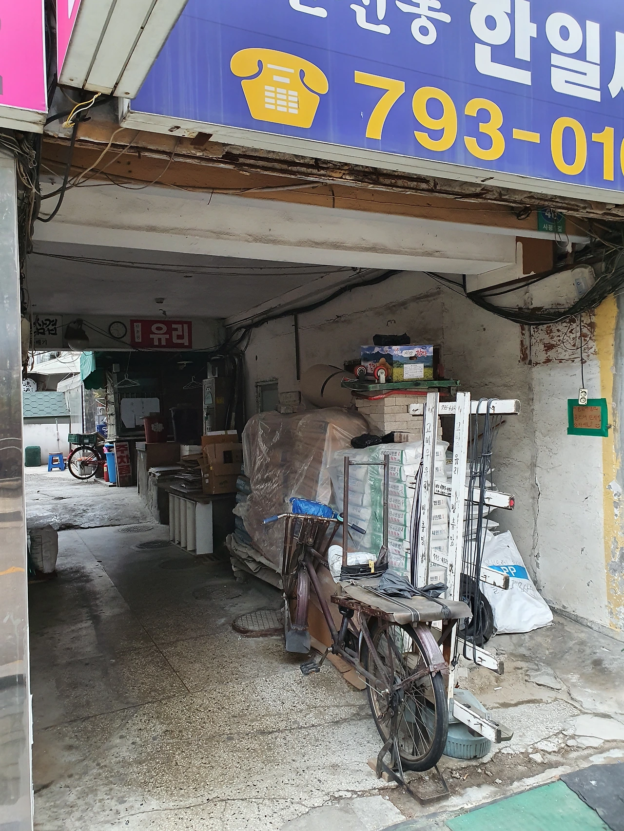 사진) 야래향 아래 이촌 시장 골목길 터널. 자전거 뒷부분 틀에는 '고바우 유리'라고 적힌 문구도 보인다. (2022. 2월)
