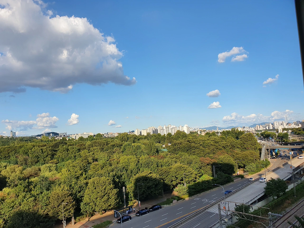 그런데 한강이 전혀 안 보이는 이촌동 반대쪽 끝에서도 그 정도로 멋진 경치를 또 볼 수 있다. 바로드넓고 푸른 용산 공원이 바로 눈앞으로 내려다보이는 경치다. 이촌동 남쪽에 한강이 있다면 북쪽에는 이 용산 공원이 있는 것이다.
