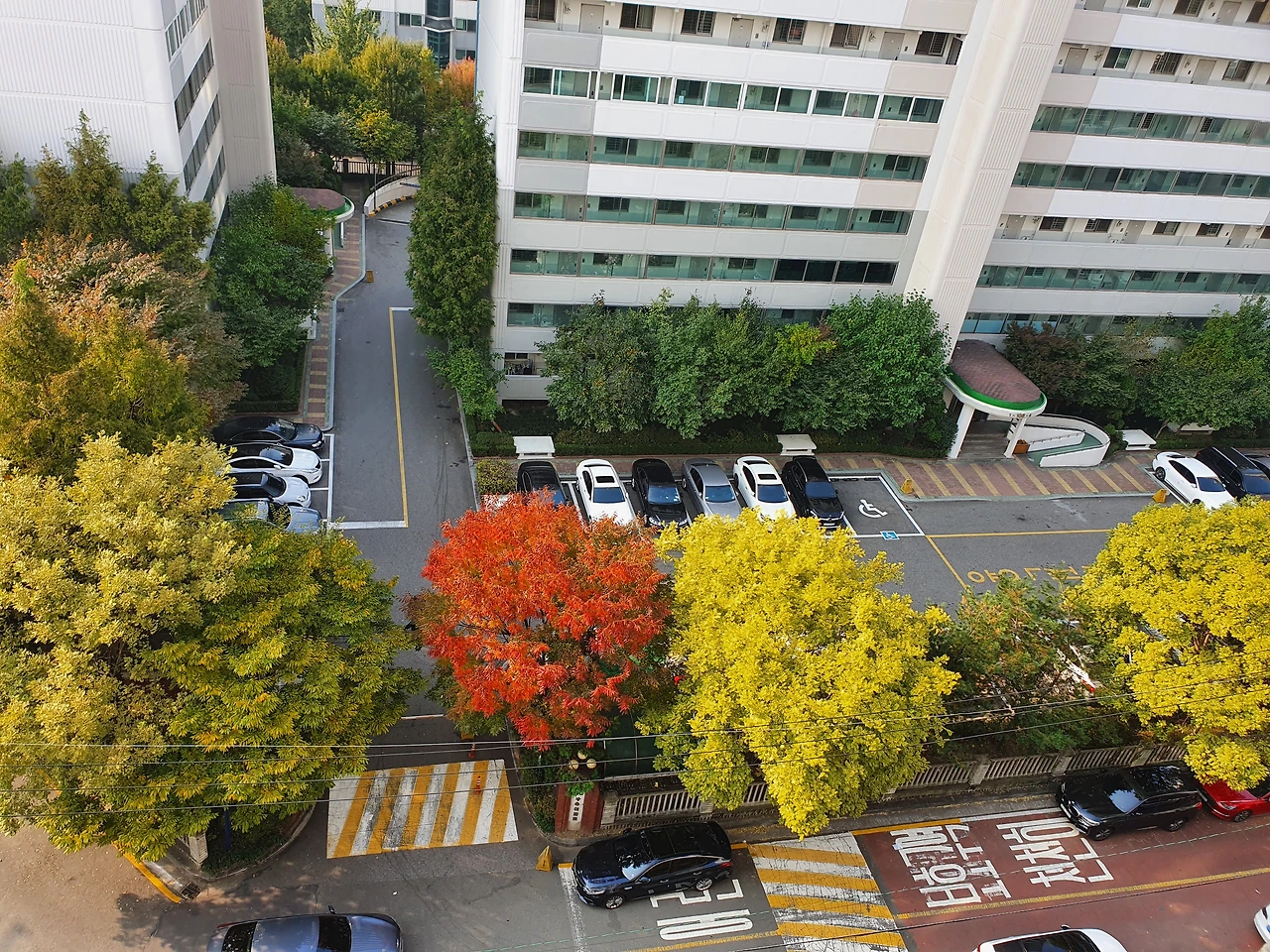 사진) 베란다에서 내려다본 나뭇잎 색의 계절별 변화