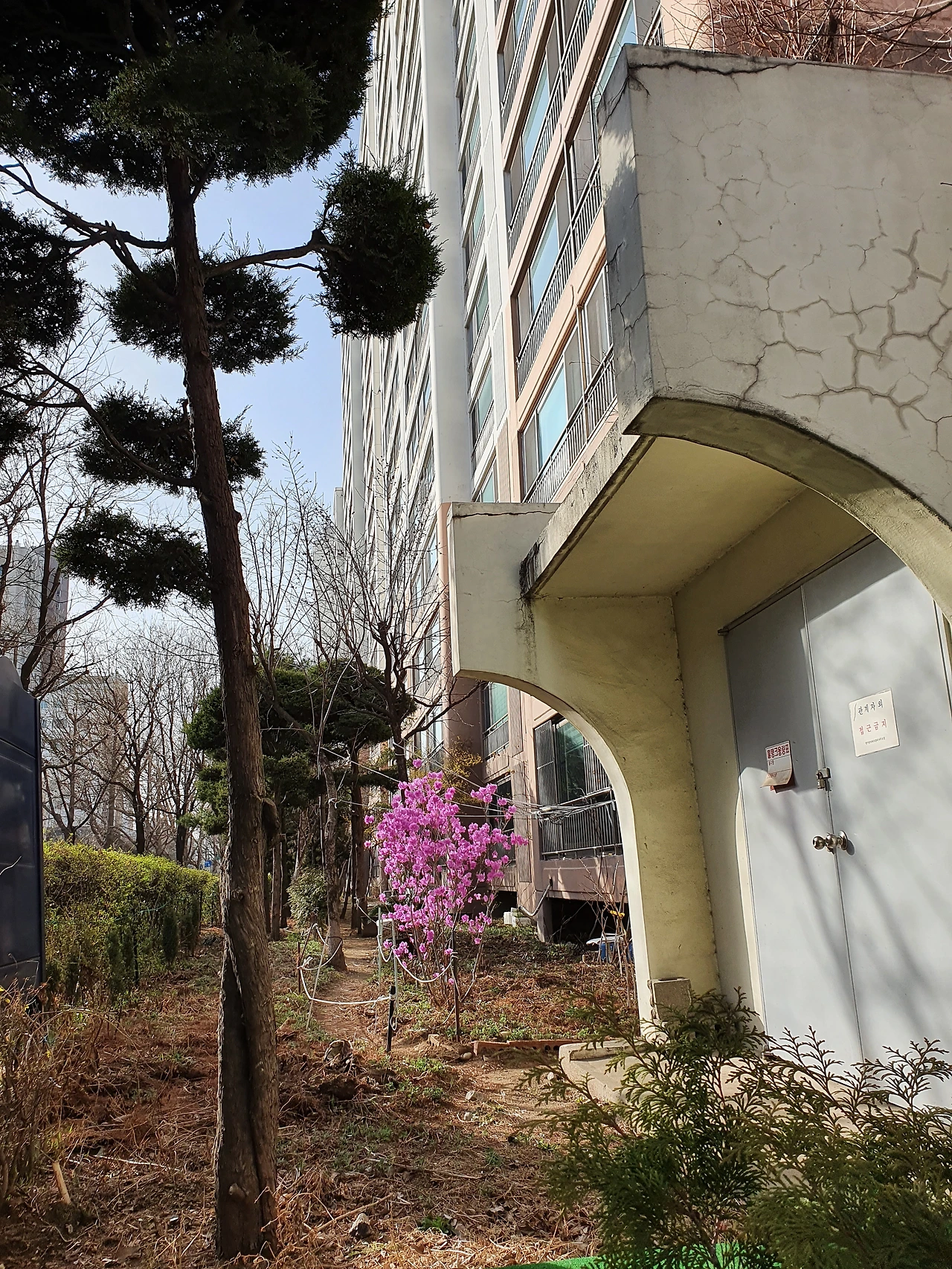 로얄 맨션 바로 옆 한가람 211동 도로변에는 작지만 매우 짙은 분홍색 꽃이 피는 나무가 있다. 바로 진달래다.