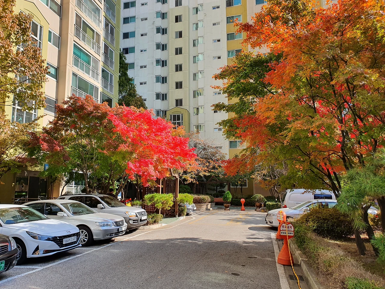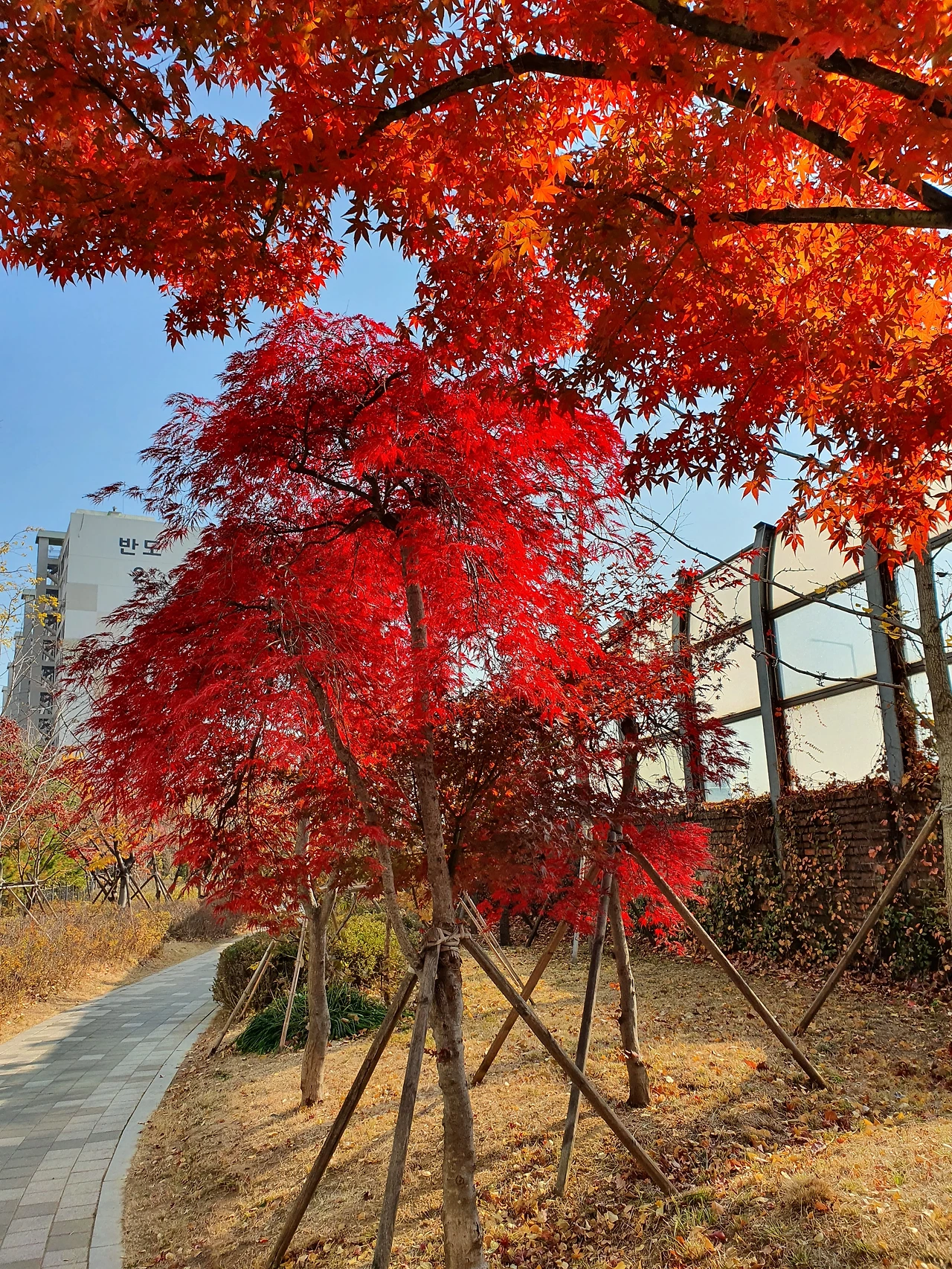 사진) 대우아파트 104동 앞에 있는 단풍나무. 주변 나무와 비교해봐도 유독 그 색이 짙은 것을 느낄 수 있다. (2020. 10월)