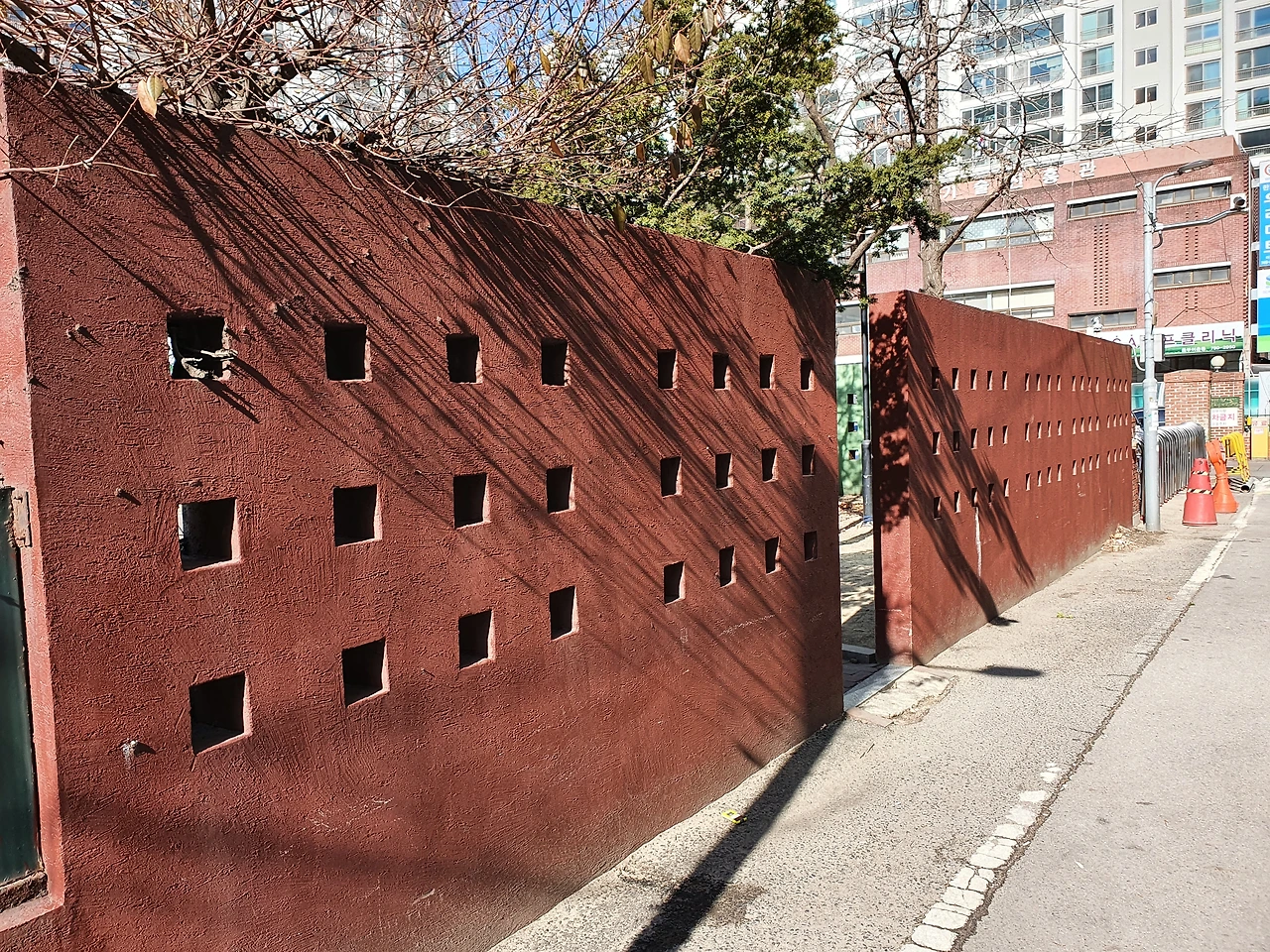 두 번째는 구 이촌 파출소 뒤편에 있는 꿈나무 어린이 공원의 담이다. 눈에 잘 띄지 않지만 관심을 갖고 보면 이 담은 나름 꽤 특이한 디자인이다. 벽을 온통 붉은색으로 칠한 것도 특이하지만 작은 사각형 구멍이 담 전체에 뚫려 있는 것도 이색적이다.