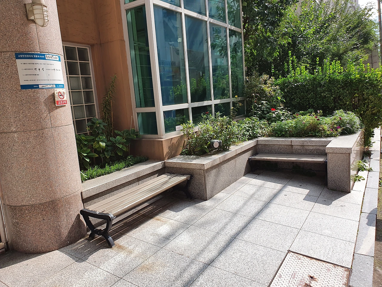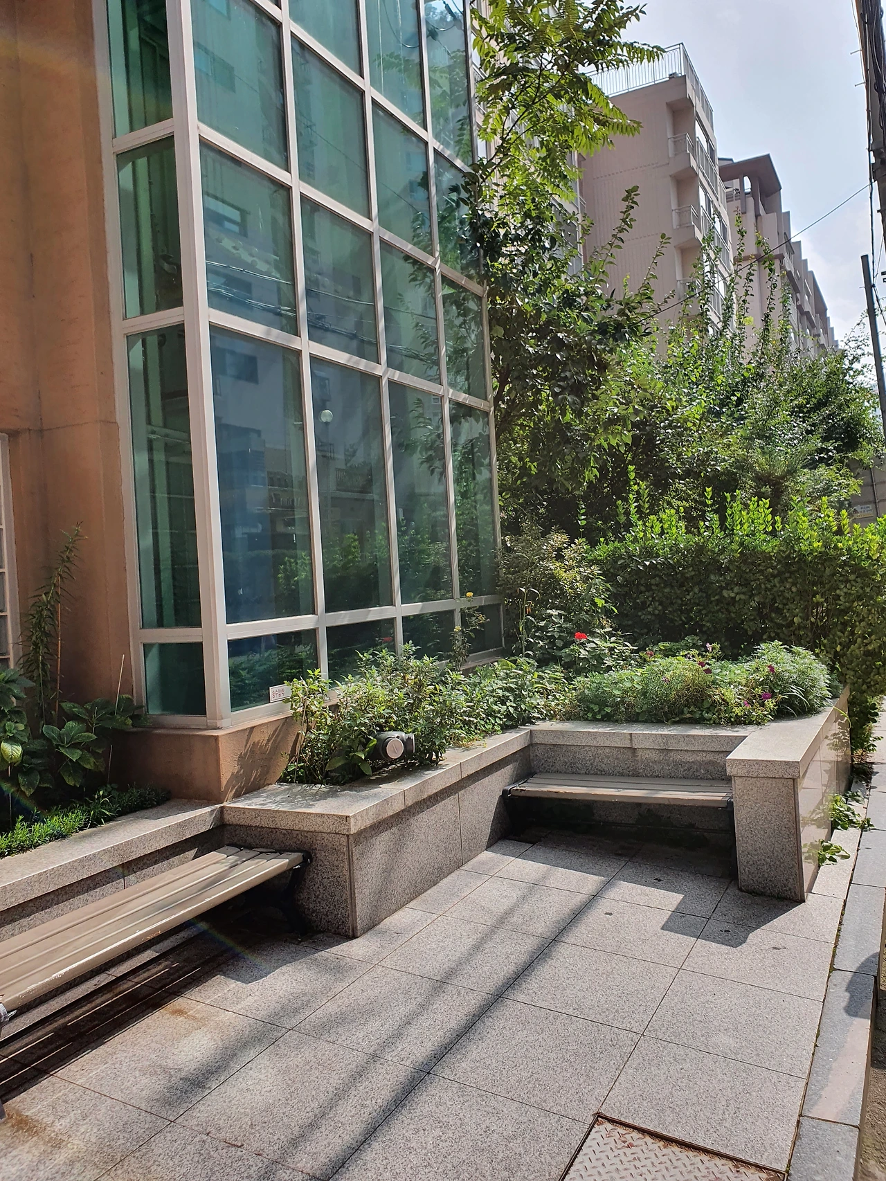 작고 평범한 공간이지만 자세히 보면 이 공간은 화단, 의자, 대리석 등이 건물 설계 시점부터 나름 세밀하게 의도됐던 것 같다는 느낌을 다분히 받을 수 있다.