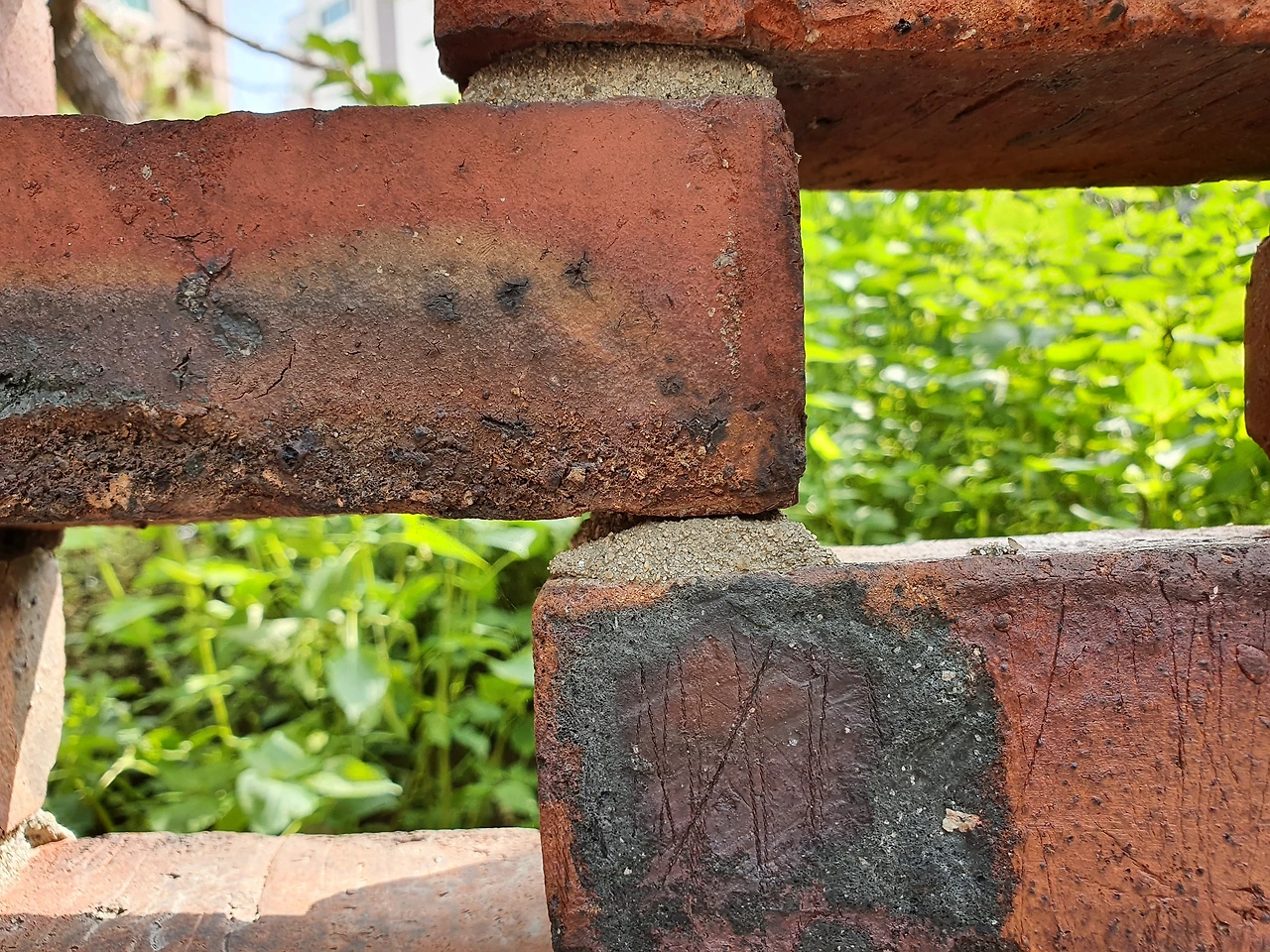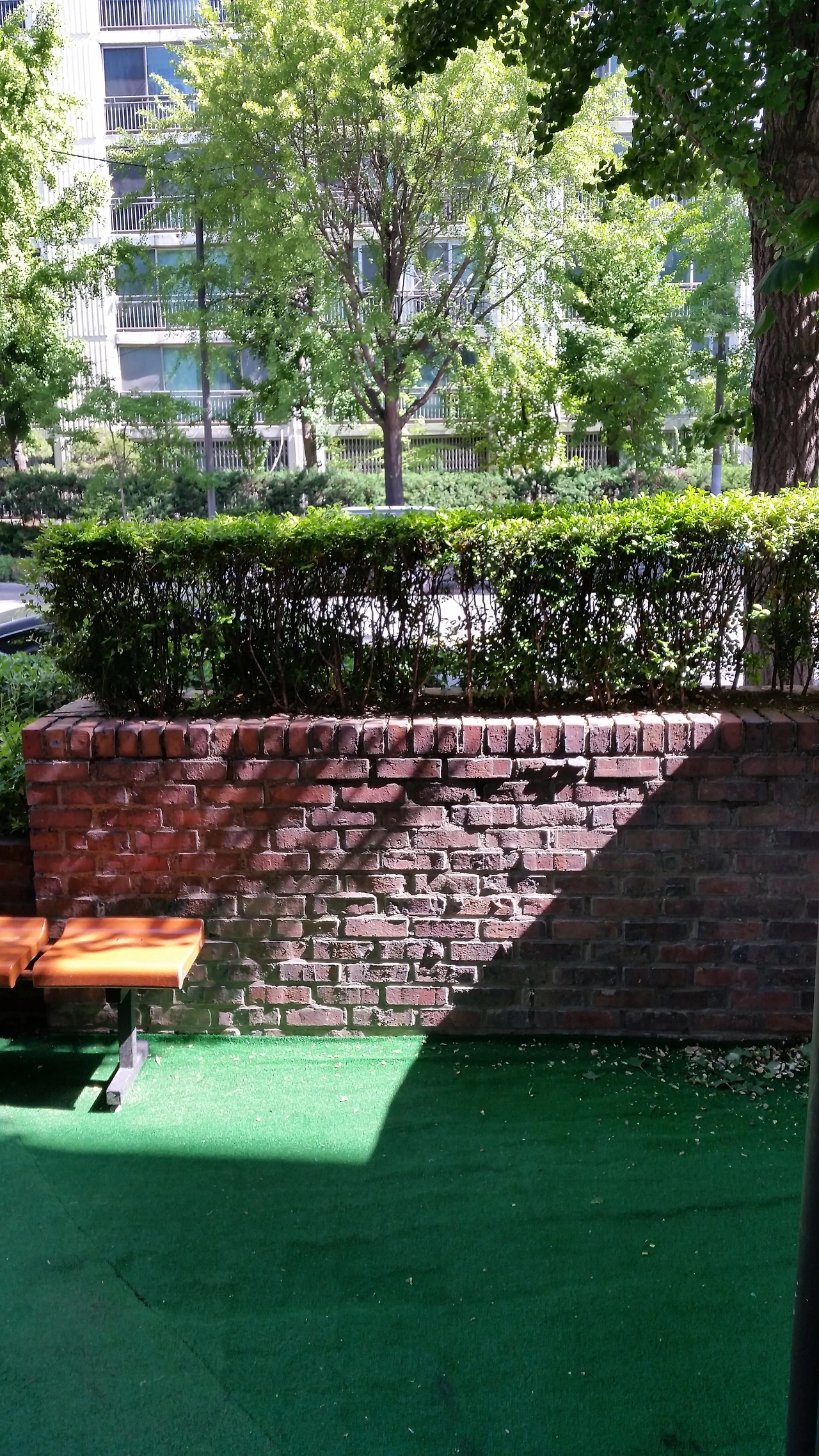첫 번째는 동부 센트레빌 옆 정우맨션 담이다. 이 담은 벽돌들을 어긋나게 쌓아 올려서 벽돌들 공간 사이로 아파트 내부가 보이게 되어있다. 정우맨션이 1972년에 완공이 된 아파트이니 이미 반백년이 된 아파트인데 그 오랜 세월을 이 벽돌들은 아파트와 함께 버텨온 셈이다. 이 벽돌 사이로 보이는 아파트 마당을 바라보면 그 반백년의 세월이 희미하게 보이는 것 같기도 하다.