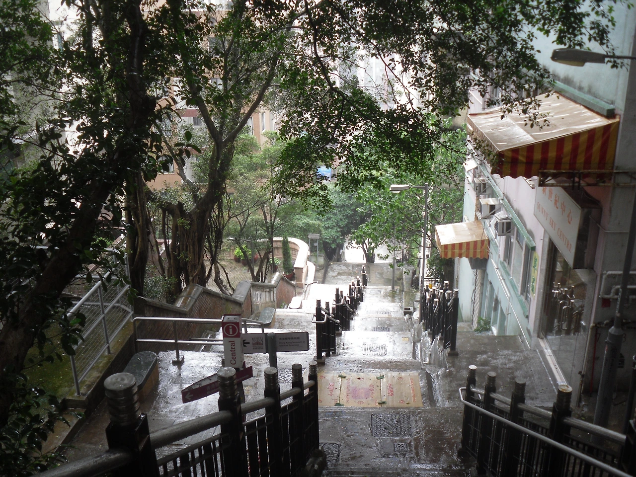 Sheng Wan에서 Mid-Levels로 가는 길에 있는 Ladder Street라는 계단 길 모습. 근처에는 오래된 나무와 건물들이 많은 곳인데, 비에 촉촉이 젖어 있는 가파른 계단 모습이 영화의 한 장면을 보는 것 같다.