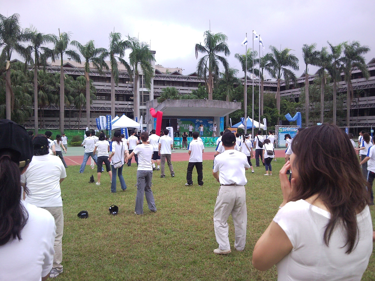 타이베이 초등학교 교정 모습. 법인 근처 초등학교에서 법인 직원 전체가 참석하는 체육 대회를 할 때 사진인데, 교정만 보면 한국의 초등학교 교정 모습과 별 차이 없지만 교정에서 자라는 나무가 야자수인 것을 보면 여기가 한국이 아니라는 것을 바로 알 수 있다.