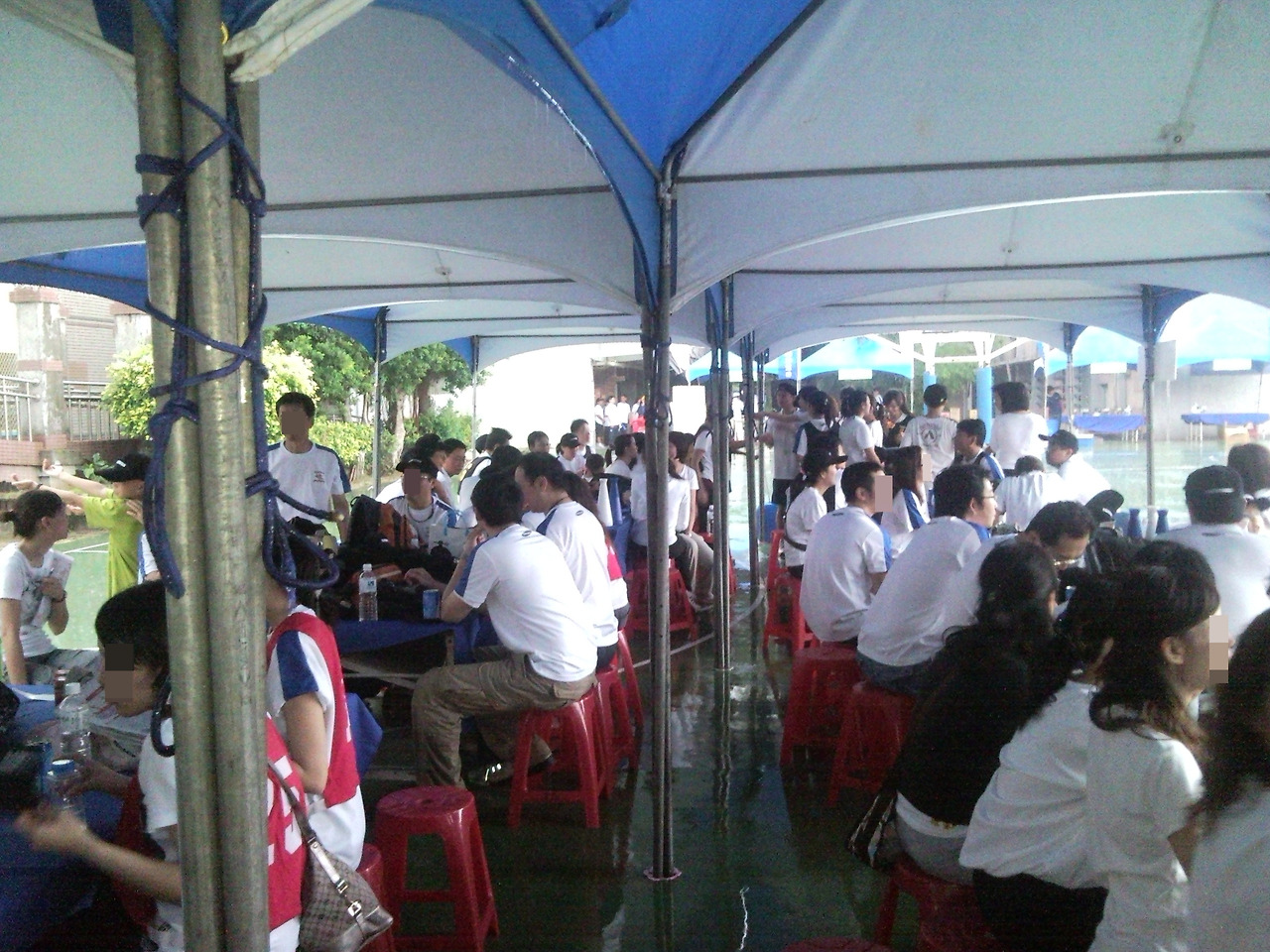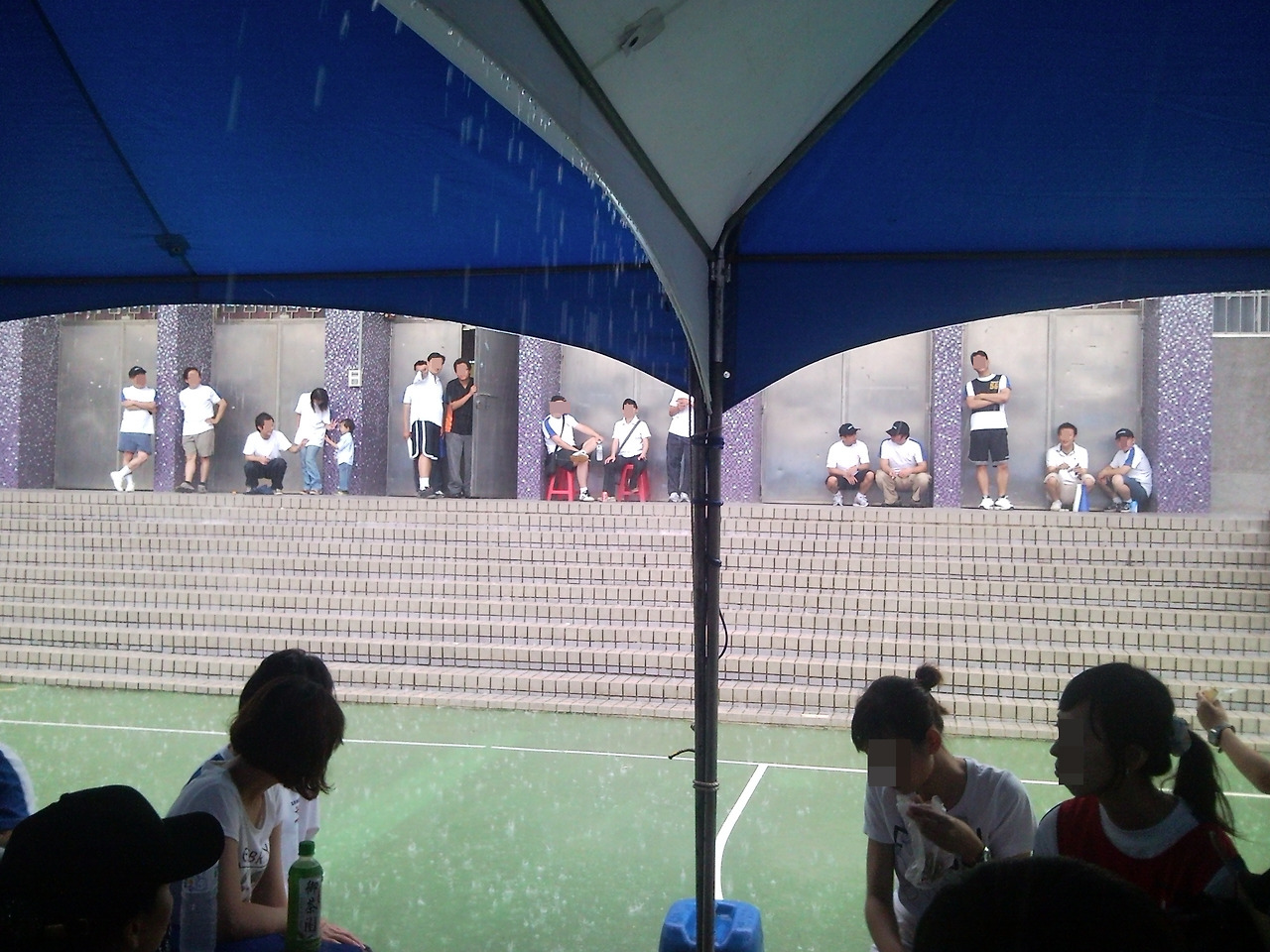 여전히 비 그치기를 기다리는 모습. 비가 자주 오는 지역이라 그런지 이런 천막이 교정 한쪽에 이미 설치되어 있었다.