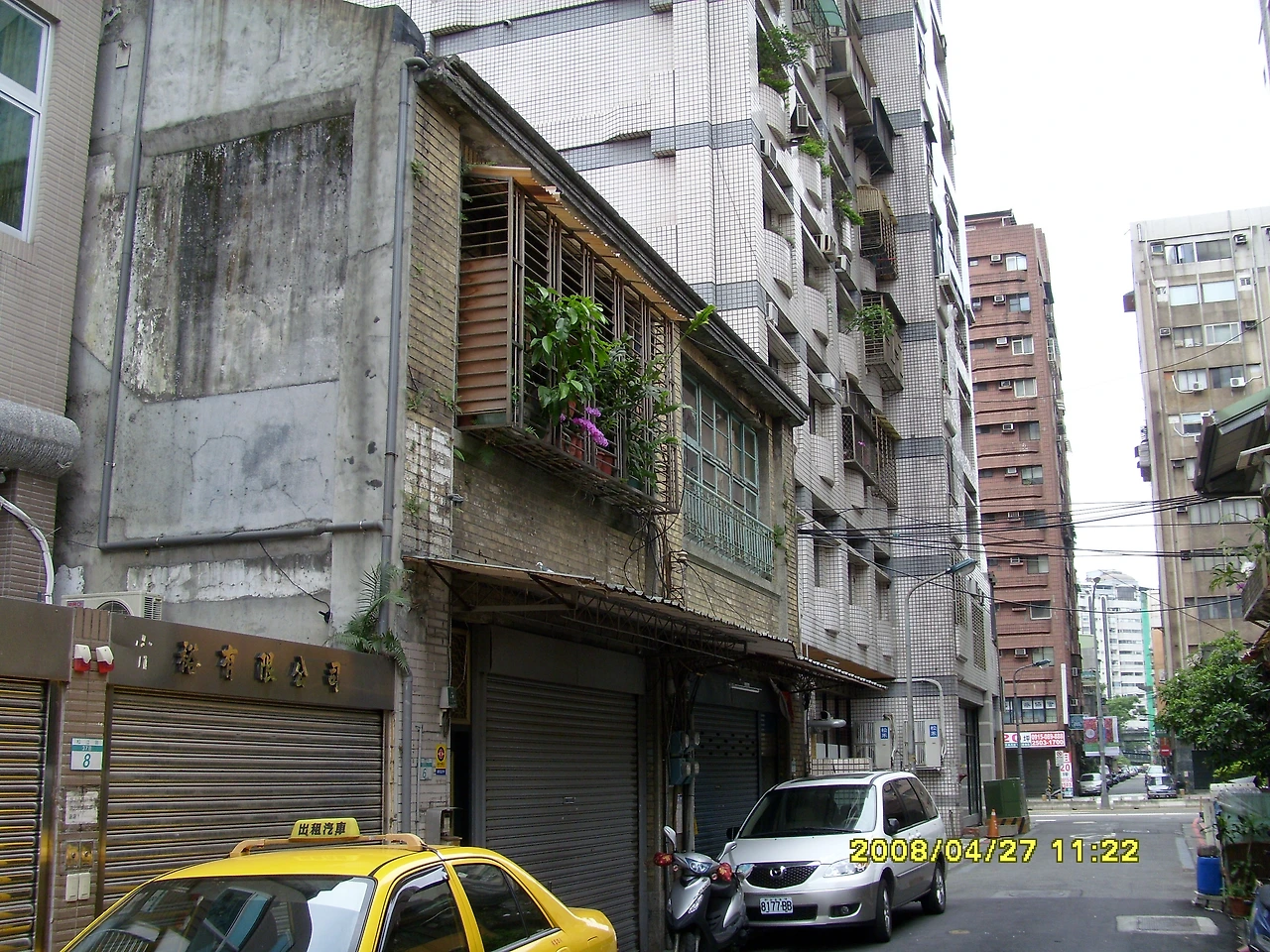 좁은 골목을 사이에 두고 나란히 서 있는 낡은 건물들. 사진 중앙에 보이는 건물도 역시 매우 낡아 보이지만 그래도 옥상은 초록색 잎이 무성한 화분들로 꾸며져 있다. 오른쪽에 보이는 간판은 일종의 만두 같은 '수전포'를 파는 가게 간판인데, 일요일이라 그런지 문을 닫았다. (대만의 수전포 소개 블로그 https://blog.naver.com/brentparker/220729459548)