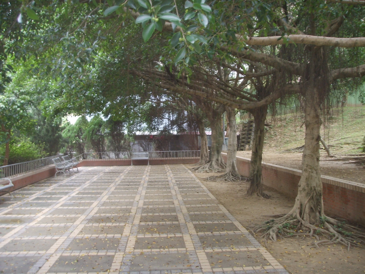 길가의 휴식 공간. 뿌리가 가지에서도 무성하게 자라는 전형적인 아열대 지방의 나무들이보인다
