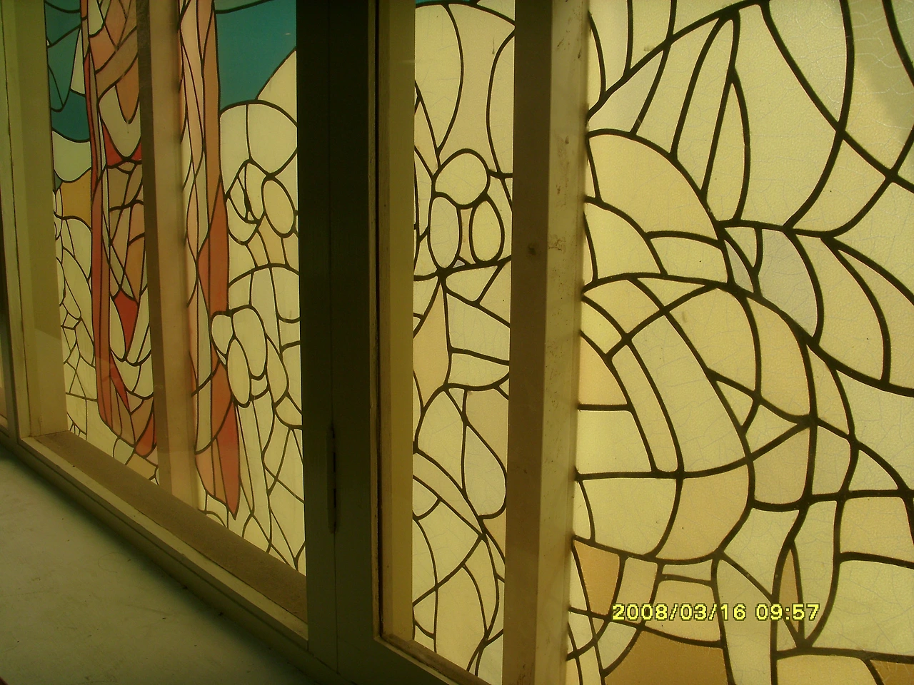 한인 교회의 도로 쪽에 인접한 창문. 항상 맨 뒤 이 자리에 앉아 예배를 봤는데, 창의 디자인도 독특하지만 반투명 유리창을 통해 들어오는 은은한 햇살로 묘한 느낌이 들곤 했던 자리다.