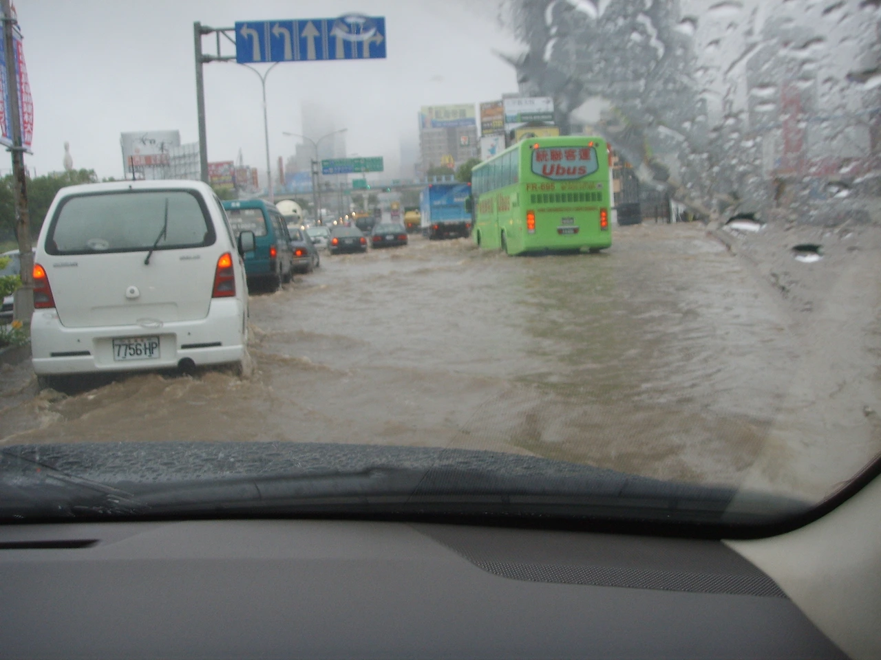 폭우 속에서 가오슝 시내를 주행하는 차량 모습. 사진 왼쪽에 보이는 승용차들의 타이어는 이미 거의 반 정도는 물에 잠겨 있다.