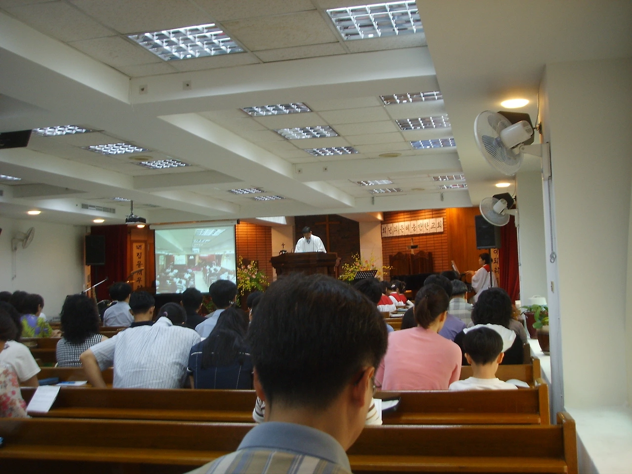 한인 교회 내부 예배 보는 모습.
