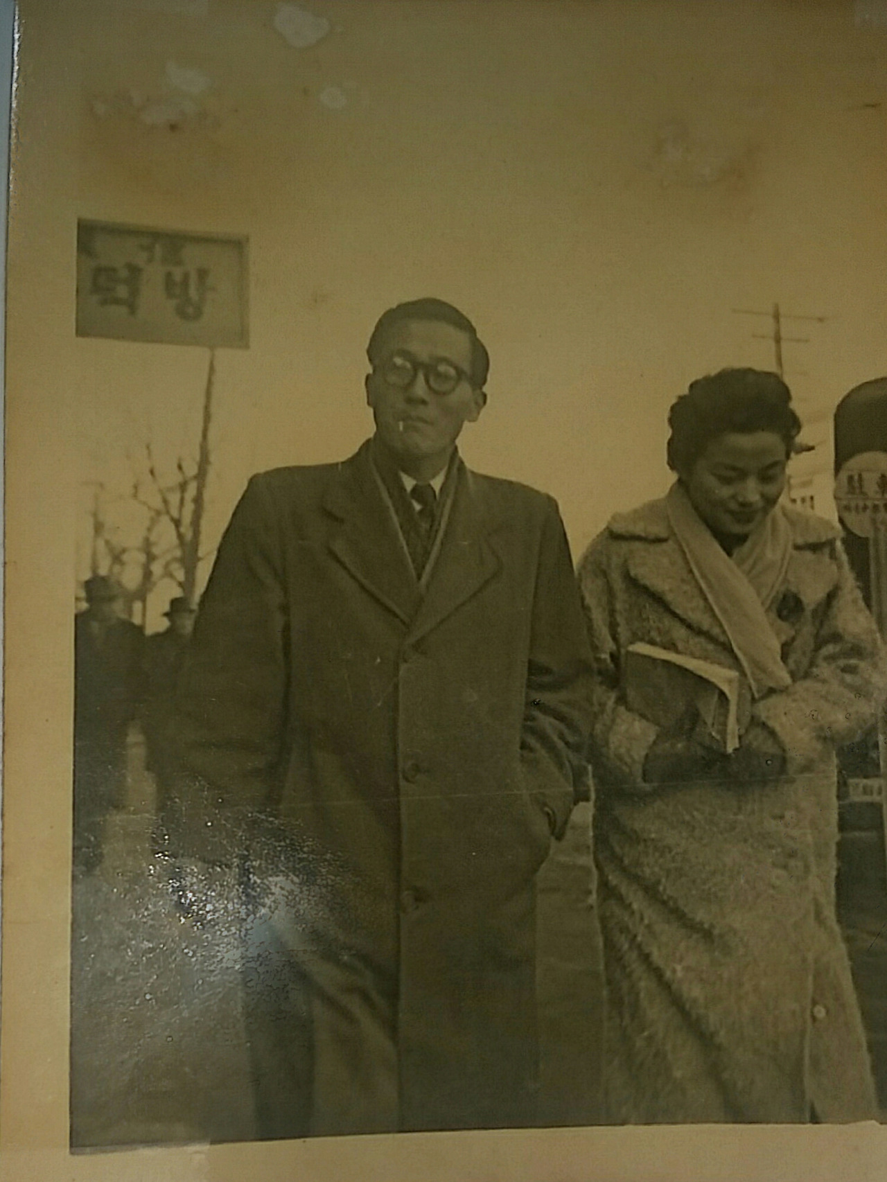 아버님과 어머님이 거리를 나란히 걸어 가시는 모습. 두터운 외투로 보아 한겨울인 것 같다. 사진 우측에는 복덕방이라는 간판의 일부도 보인다.