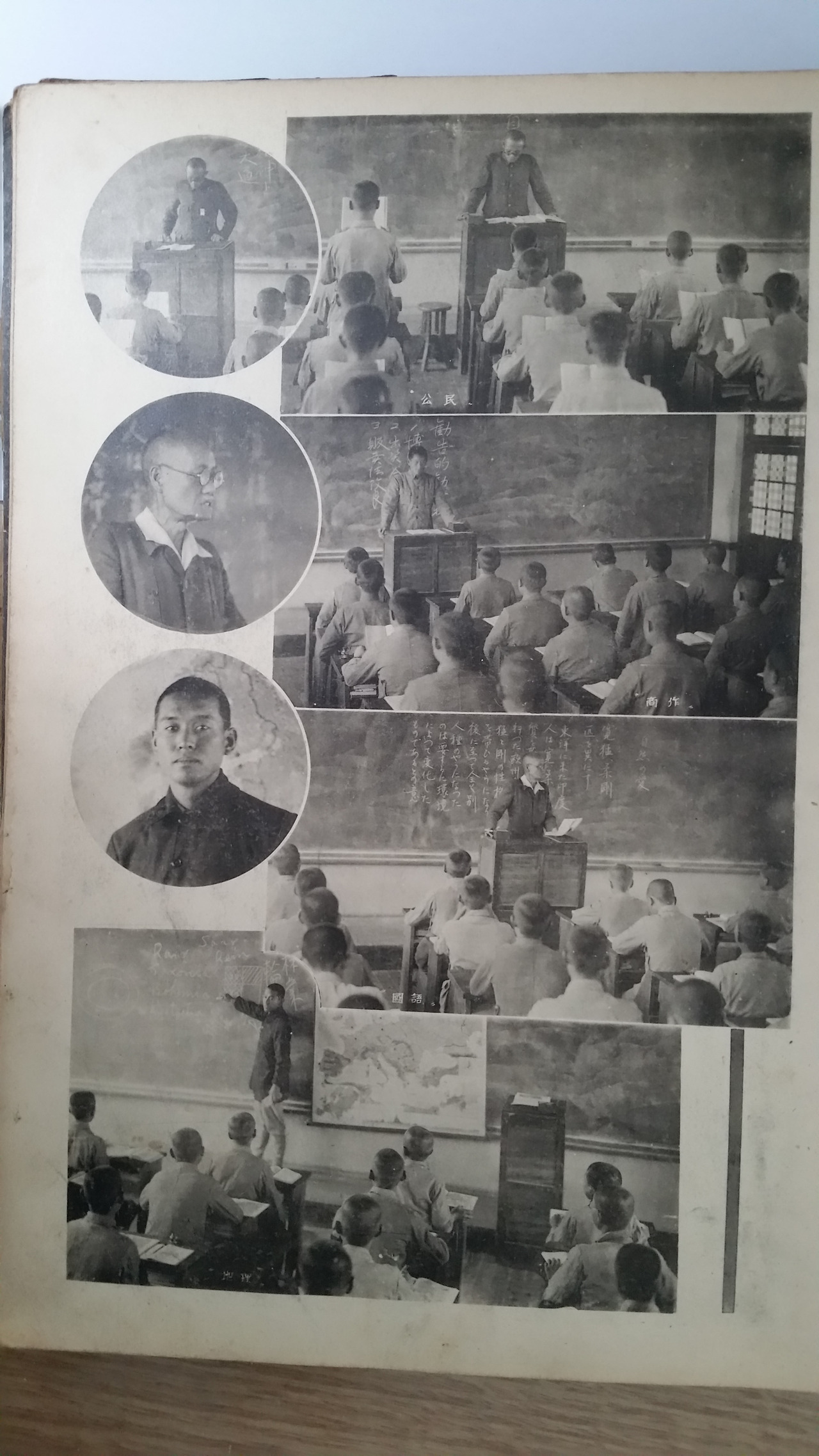 교실에서 수업받는 모습. 각 사진은 과목별 수업 장면을 찍은 사진인 것 같은데, 사진 하단에 보면 한자로 公民(공민), 商作(상작), 國語(국어), 地理(지리), 商品(상품), 商算(상산), 英語(영어), 珠算(주산) 등 교과목 이름도 같이 표기되어 있다.