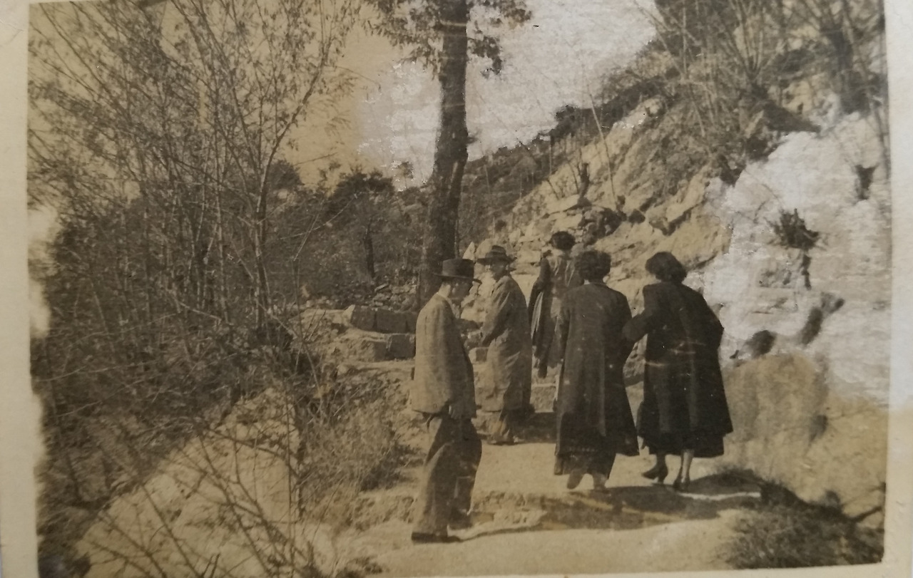 남녀 몇 쌍이 단체로 산에 올라가는 것 같은데, 남자나 여자나 모두 중절모까지 쓰고 완전히 정장을 하고 등산하는 모습이 매우 특이하다. 뒷모습만 보여서 어느 분이 아버님 어머님인지 구분이 안된다.