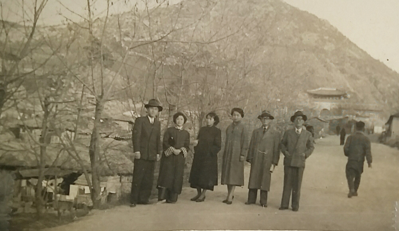 남녀 3쌍이 함께 어딘가 구경을 가면서 찍은 사진. 우측 끝이 아버님, 우측에서 세 번째가 어머님이다. 저 시대의 복장도 참 운치 있어 보인다.......