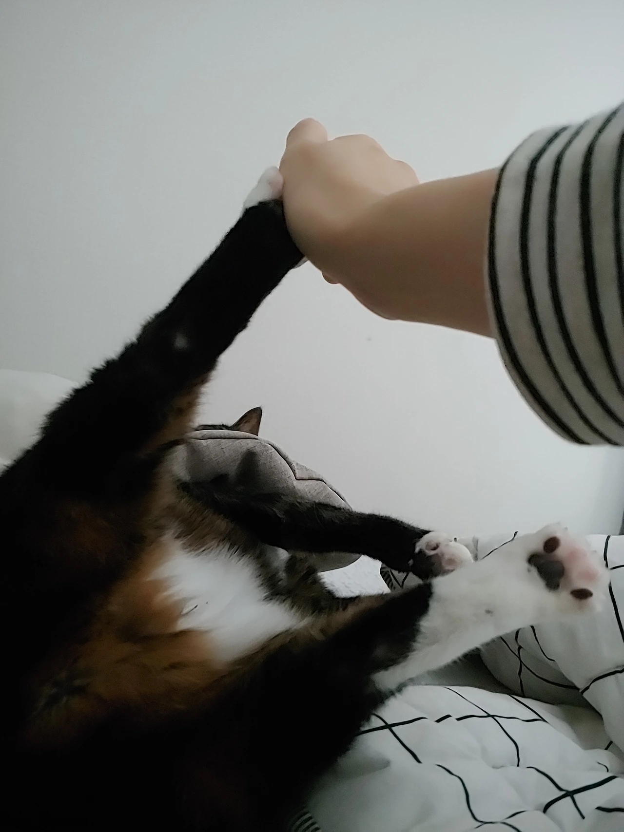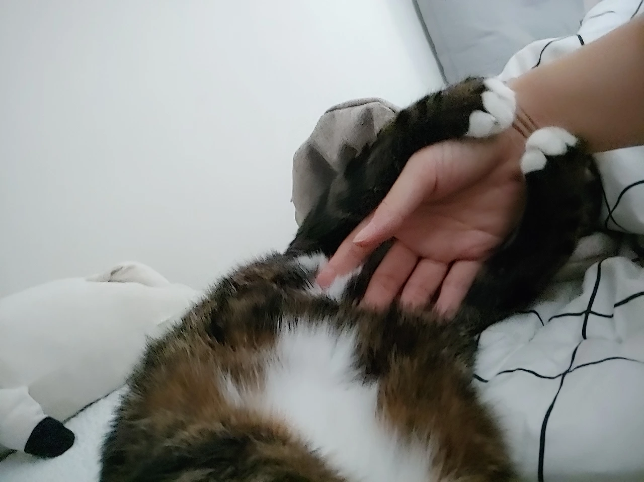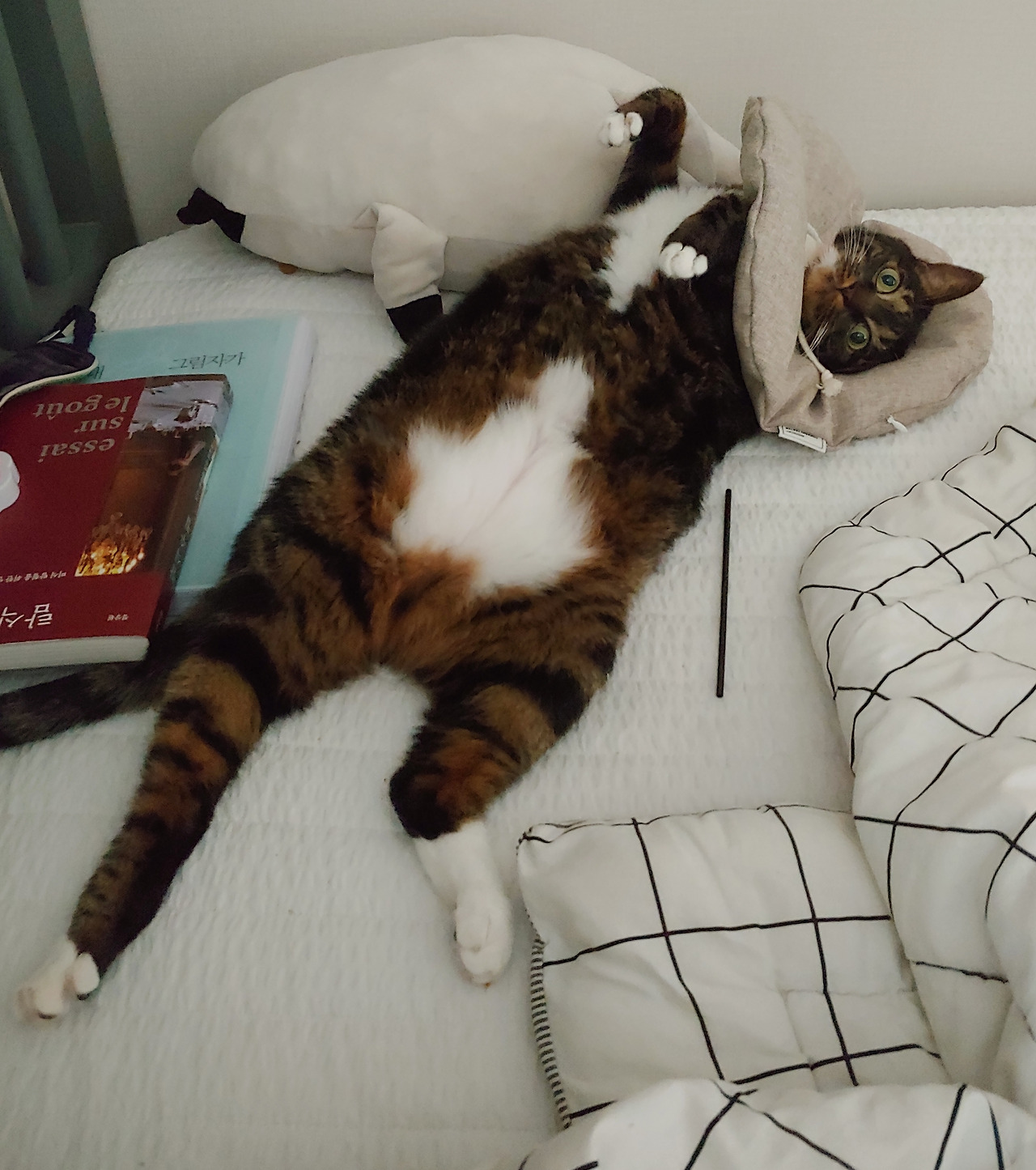 너저분한 침대 위...