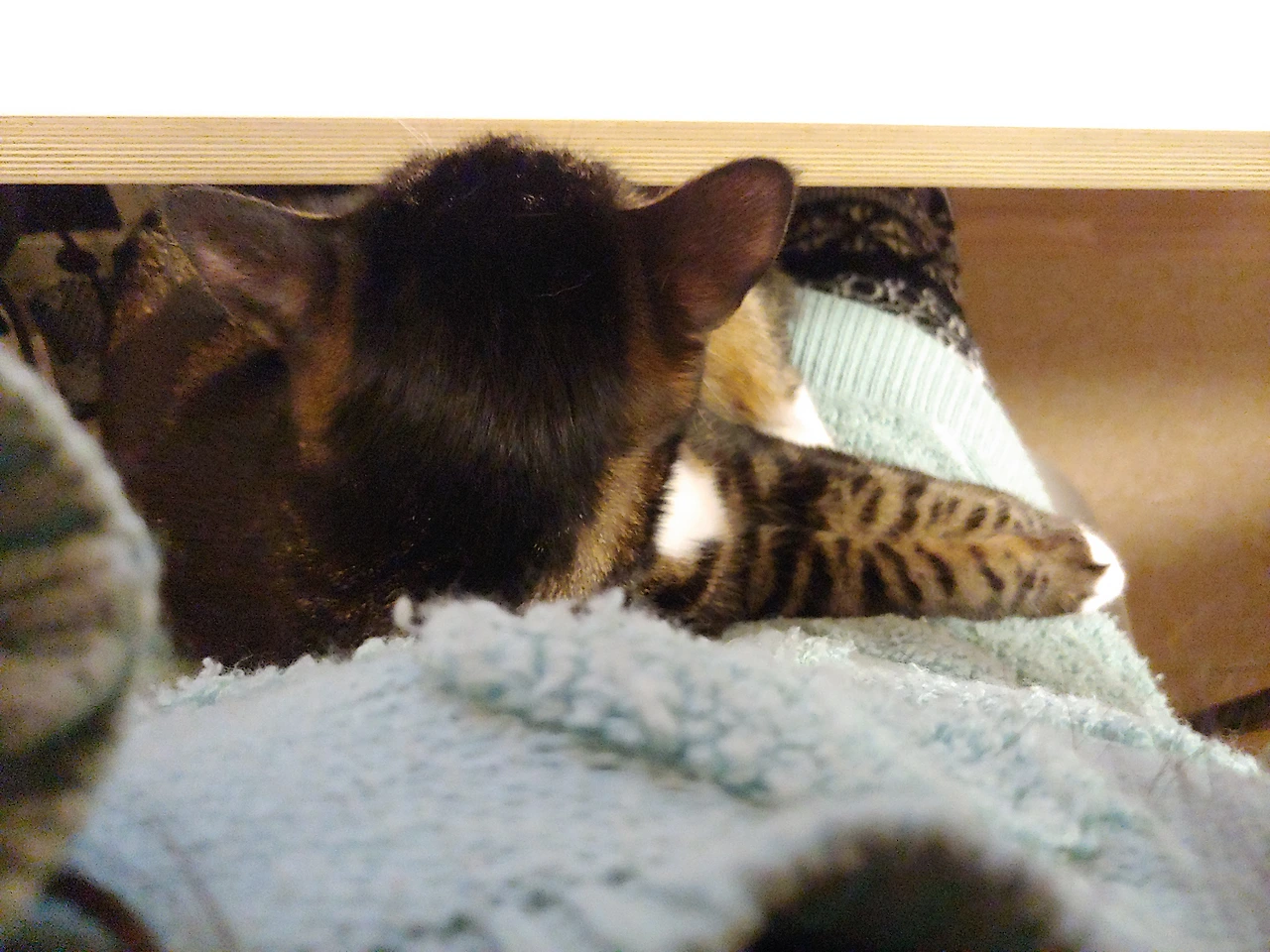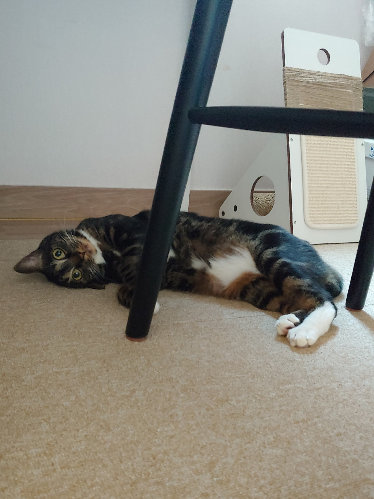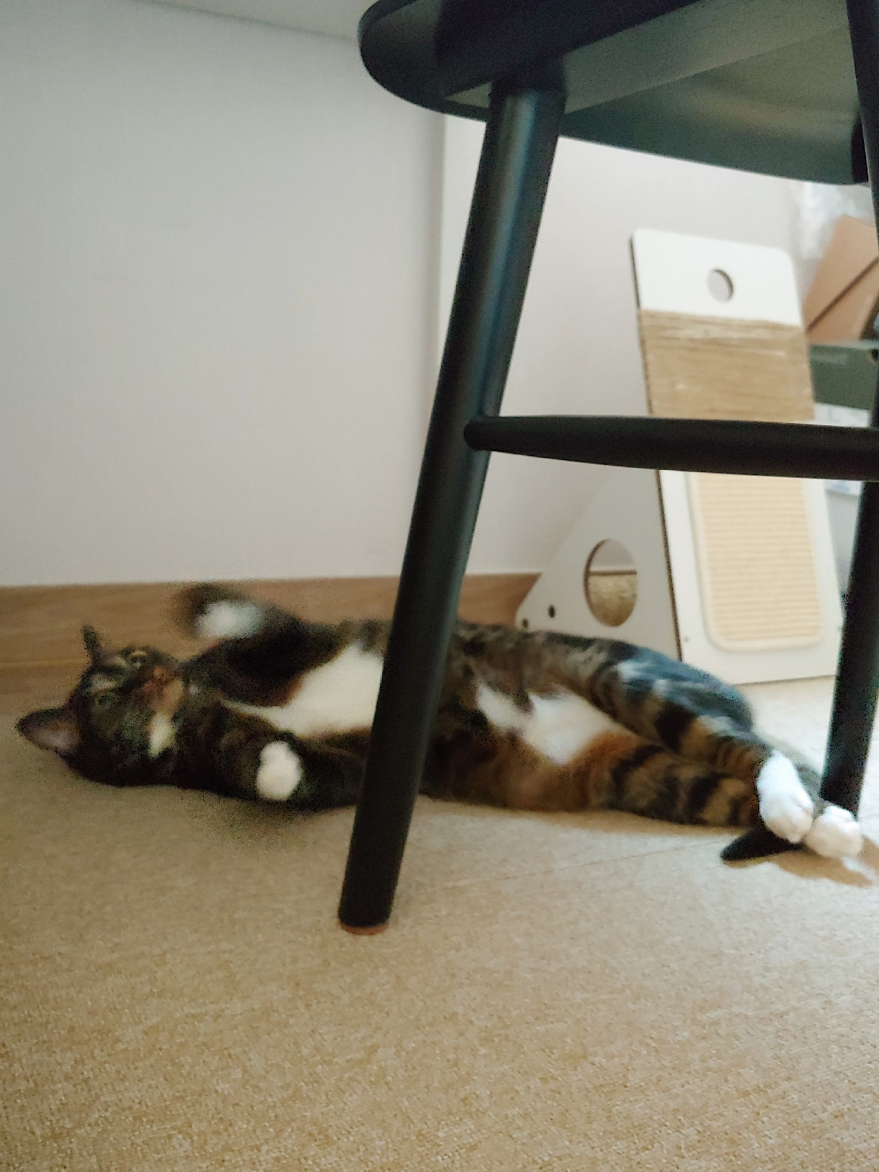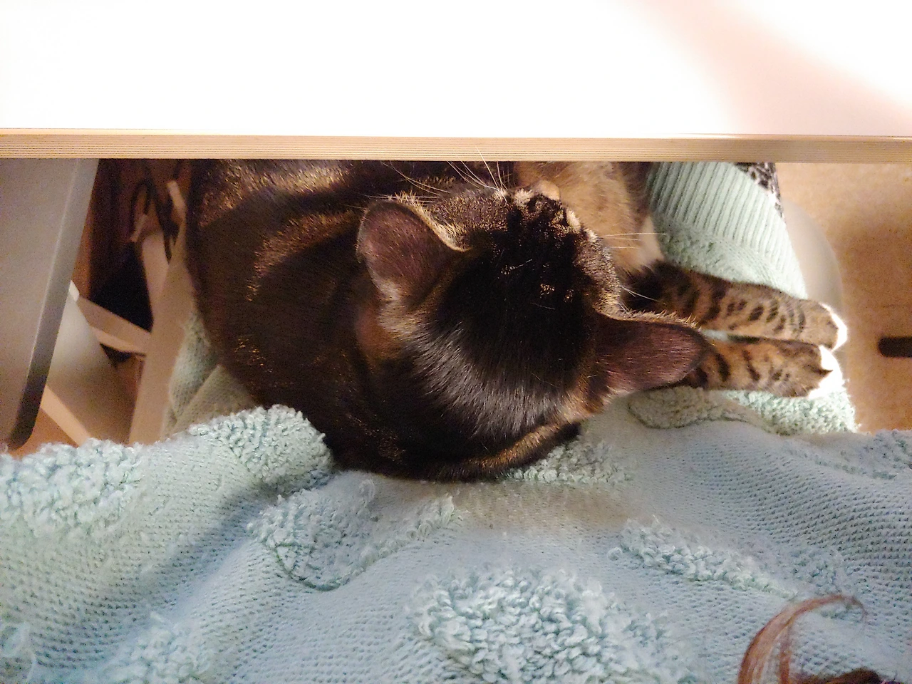 책상 밑으로 들어가는 냥아치.